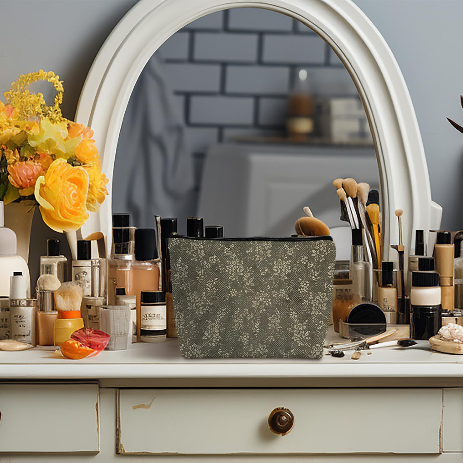 Floral Cosmetic Bag, Vintage Green Floral Toiletry Bag for Women, Botanical Wild Flowers Makeup Pouch