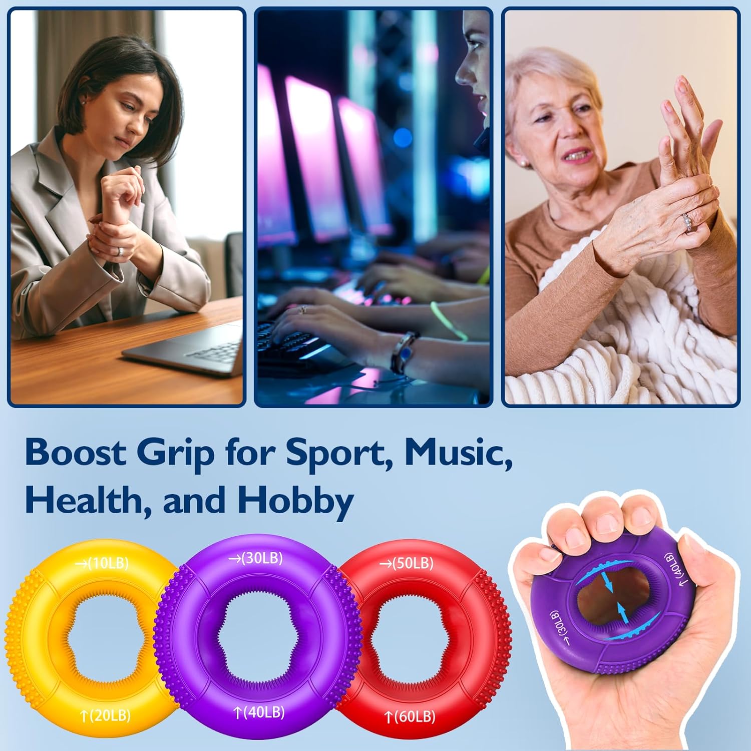 - ๐๐ผ๐ป๐ด-๐น๐ฎ๐๐๐ถ๐ป๐ด & ๐๐น๐ฒ๐ ๐ถ๐ฏ๐น๐ฒ ๐๐ฟ๐ถ๐ฝ ๐ฅ๐ถ๐ป๐ด๐: Advance your hand strength with our progressive hand gripper rings, offering adjustable resistance from a gentle 10-20LB to a tough 50-60LB. Each ring is made from premium food-grade silicone, ensuring lasting elasticity and shape retention. The non-slip textured surface provides a secure and comfortable grip.