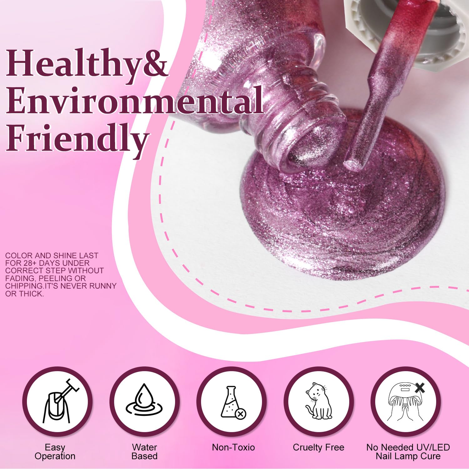 - NOTE: This nail polish is resistant to chipping and peeling, but for a longer-lasting shine, we recommend applying a top coat to keep the gloss for over 15 days!