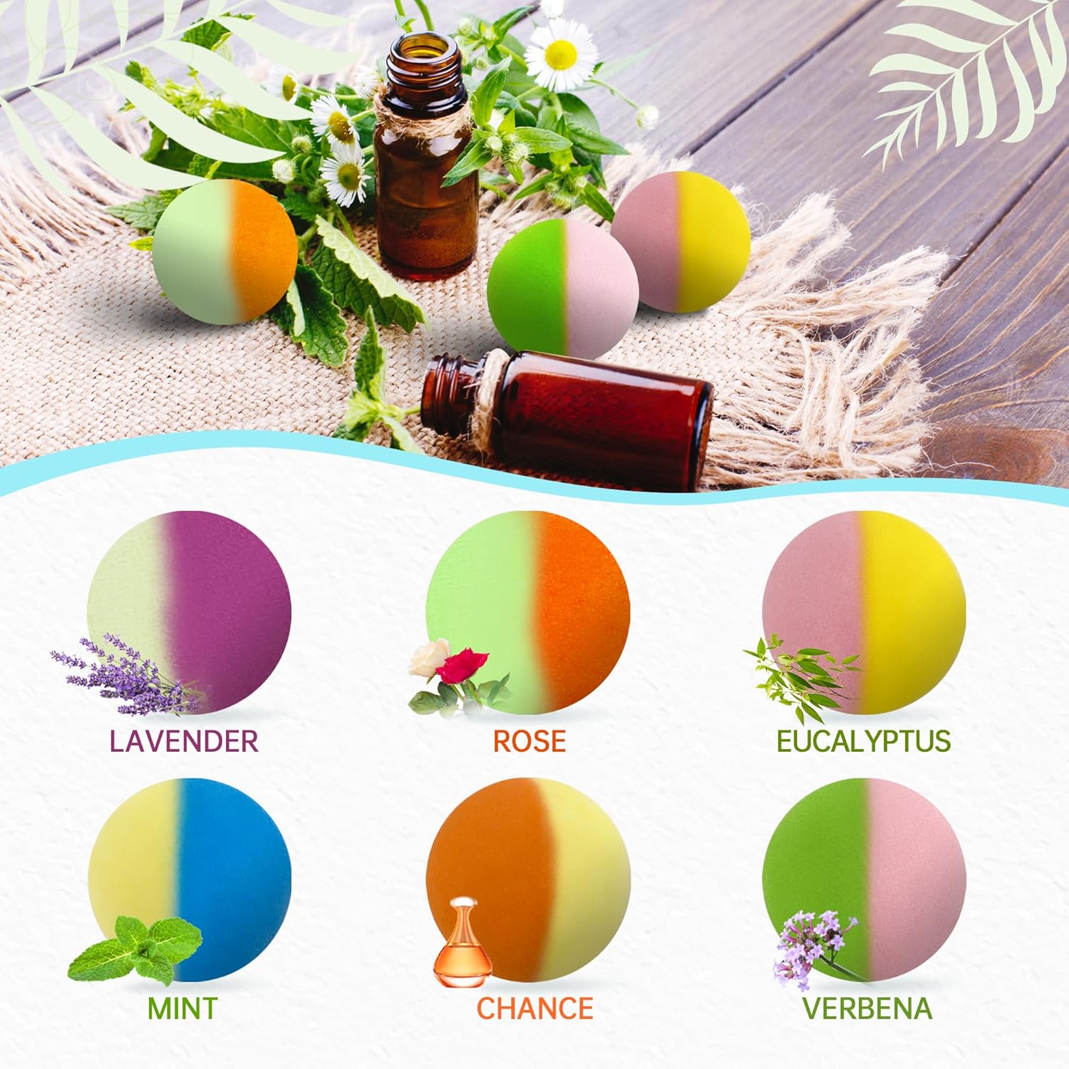- 60 PCS BATH BOMB GIFT SET - 6 Different aromas with different ingredients, 10 pieces for each aroma. 6 different fragrances including lavender, Mint, Rose, Jasmine, Milk, Lemon, and Green Tea are handmade, natural, organic, and preservative-free;