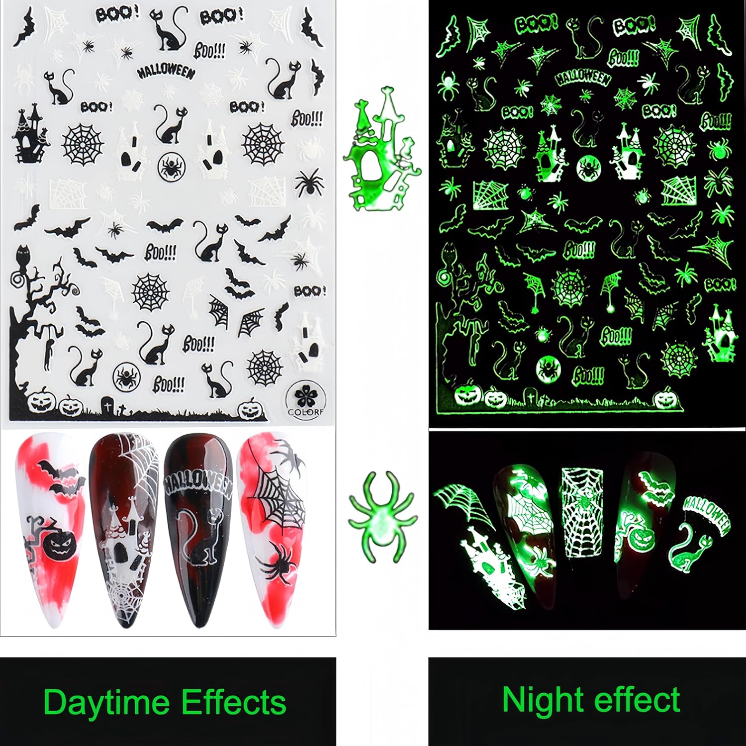 - Halloween Nail Stickers- You will get 6 sheets halloween nail art stickers for acrylic nails supply, many pattern for you to choose, fluorescent spider nail designs, and satisfy your rich imagination of nail DIY