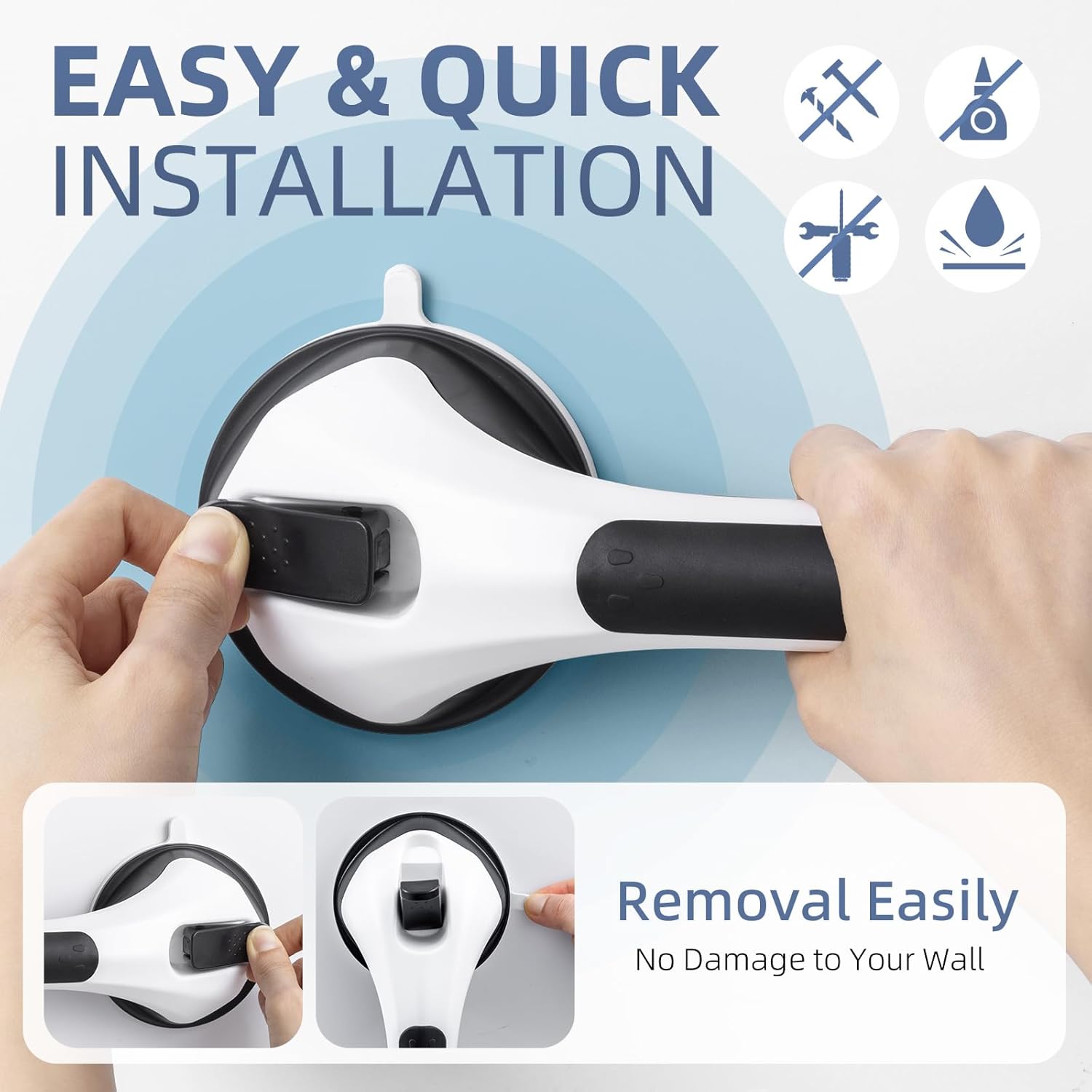 - No Drill & Easy Installation and Remove: The grab bars only takes 5 seconds to install, even the elderly can easily complete the installation.With no drilling and no hardware,you can install this grip shower handle on your bathroom easily. The safety handles can be removed without damage to the wall. The shower bars for elderly suction can be used repeatedly after dismantling and washing.