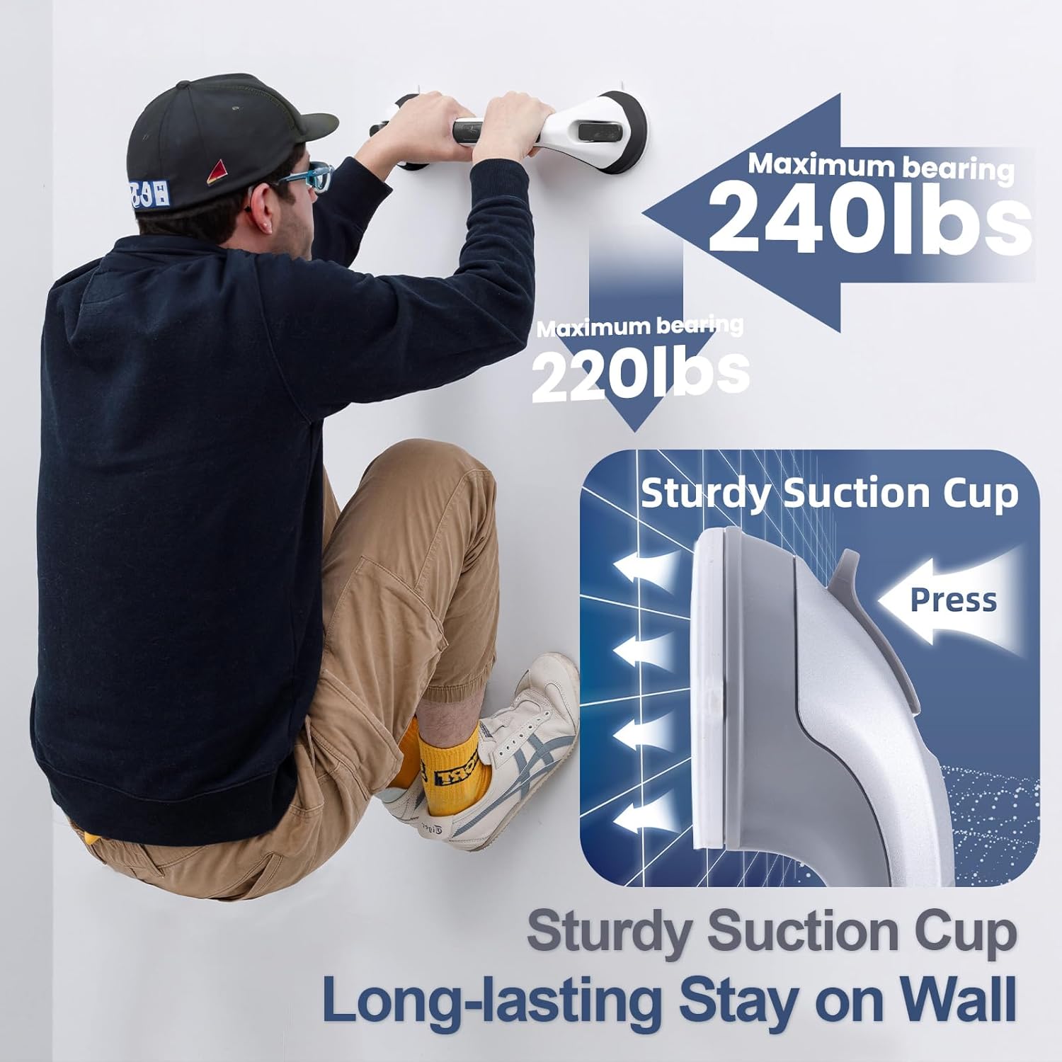 - Powerful Suction & Strong Bearing: Crafted from the ABS material and imitated the absorption of bionics octopus sucker, the stronghold suction bathtub grab bar for shower can support up to 240 LBS at an instant. The diameter of the suction cup is 4.3 inch, which will be more and more tight on the wall over time pass. Strong suction ensures the handicap bathroom bathtub stable enough to support your balance.
