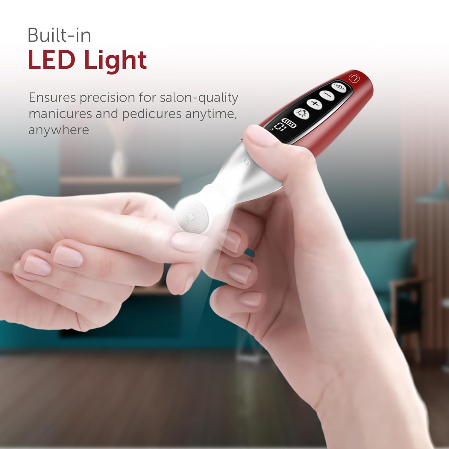 - INNOVATIVE LED DISPLAY: Seamlessly navigate desired settings with ease. The LED display indicates battery status, speed preference and rotation settings for effortless operation. The electric nail file machine is also equipped with an integrated LED-light that illuminates areas on hands and feet