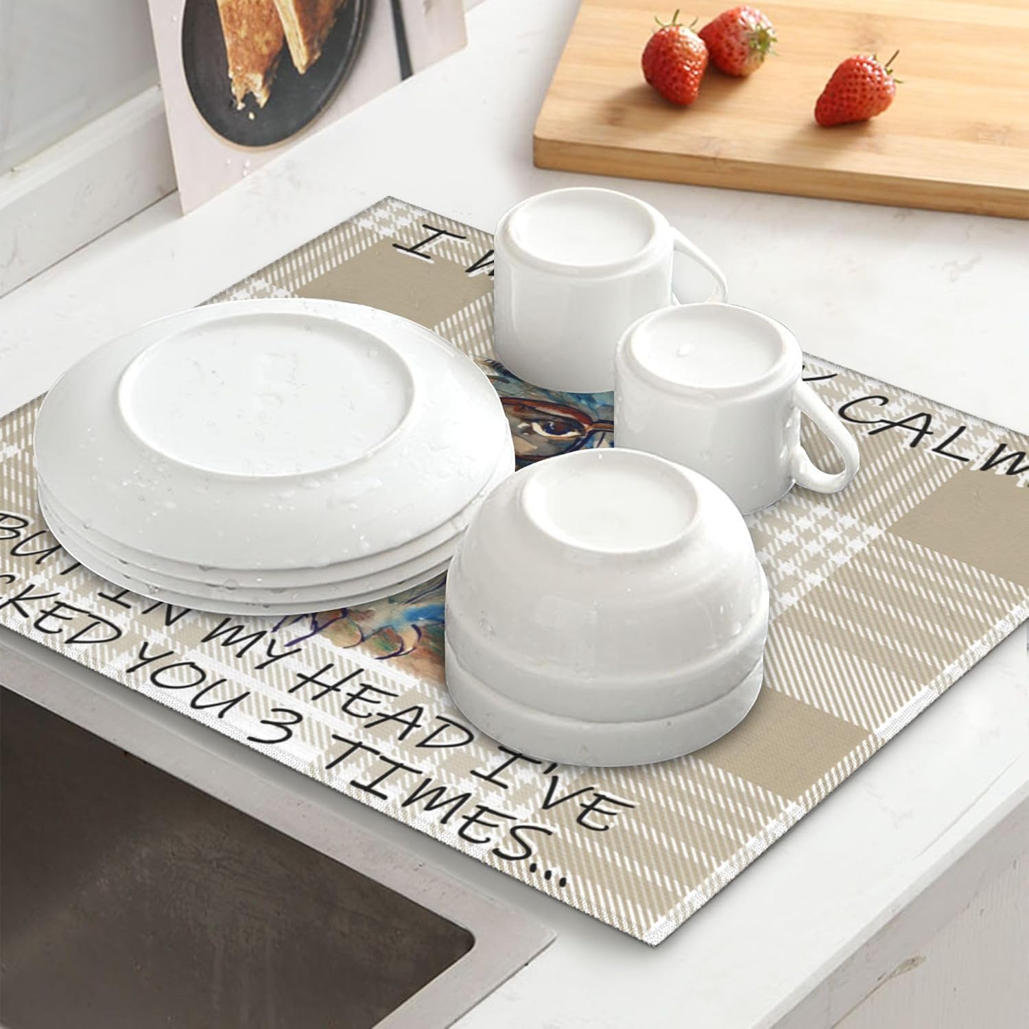 Funny Owl Dish Drying Mat for Kitchen Counter Cute Buffalo Plaid Drying Mat Washable Absorbent Reversible Microfiber Drying Pad Kitchen Accessories 16"x18"