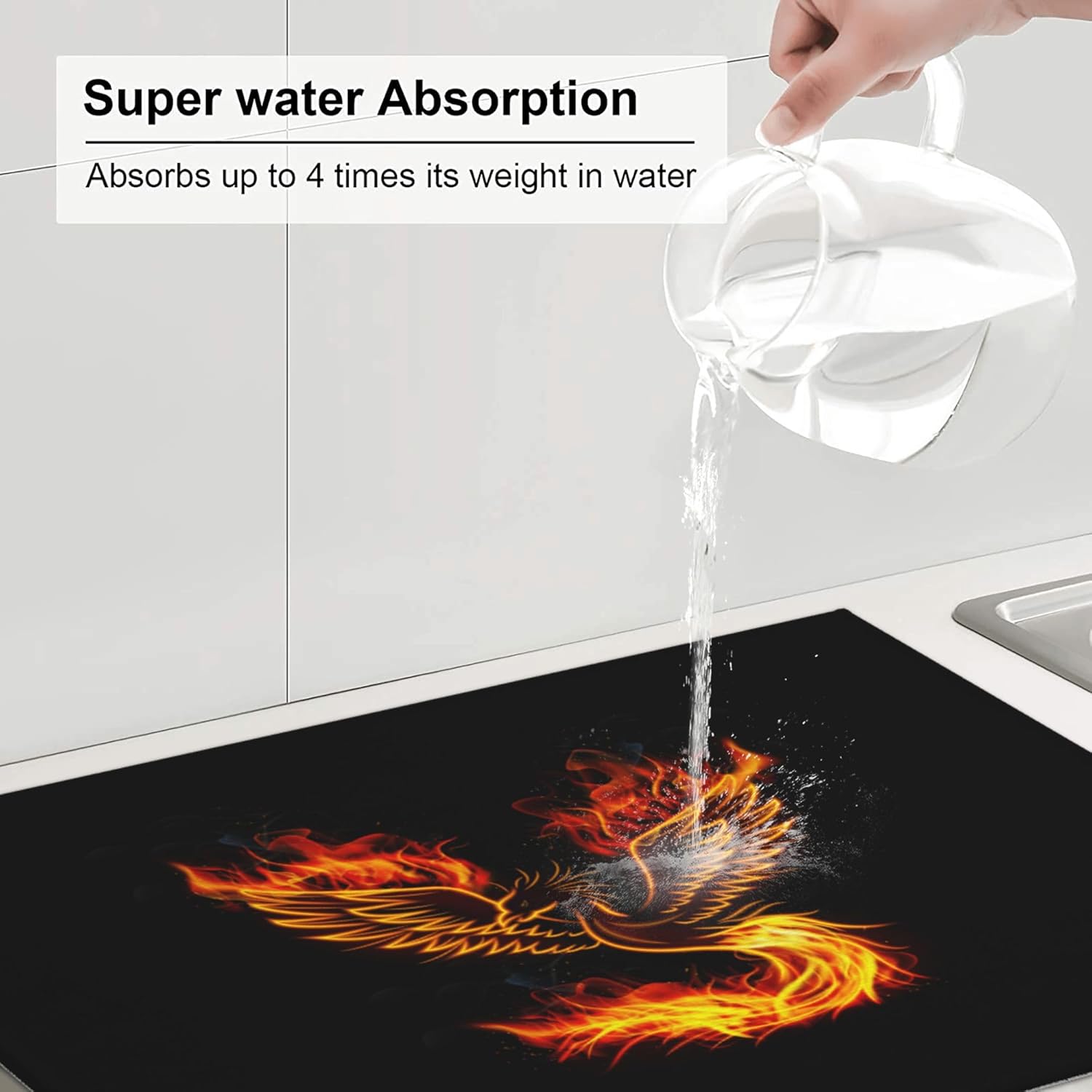 Funny Dish Drying Mat for Kitchen Counter Absorbent Reversible Fire Phoenix Drying Pad Dark Kitchen Decor Black Dish Drainer Rack Mats 18"x24"
