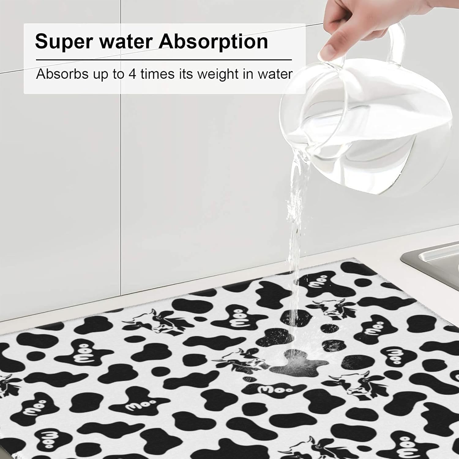 Cow Print Dish Drying Mat for Kitchen Counter Black White Decorative Dish Drainer Rack Mats 16x18 Inch Absorbent Reversible Drying Pad