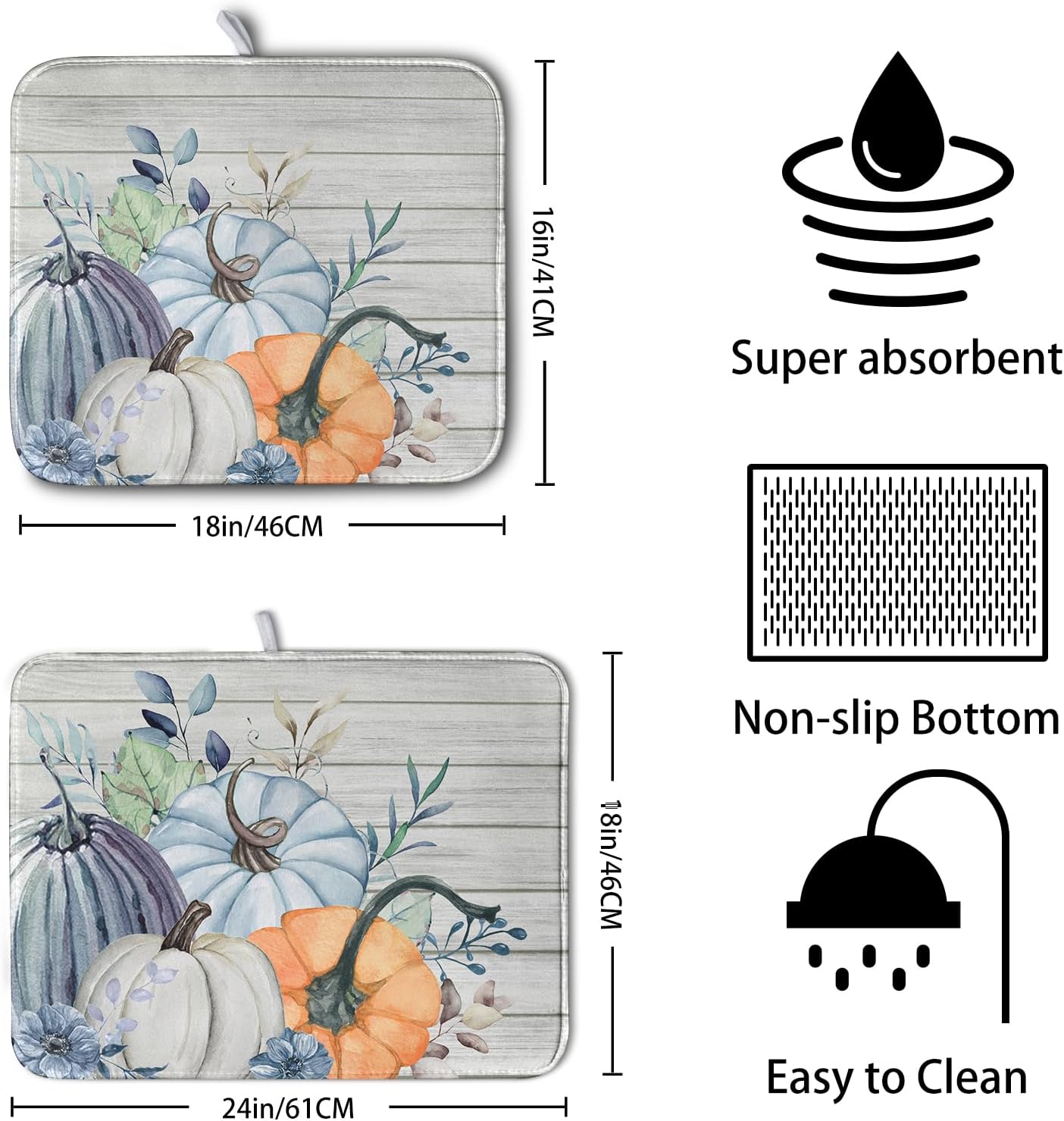 Fall Blue Orange Grey Pumpkin Kitchen Dish Drying Mat for Kitchen Counter 18x24 Inch Autumn Teal Flowers Drying Mat Thanksgiving Harvest Dish Drainer Mat Super Absorbent Dish Rack Pad for Coffee Bar