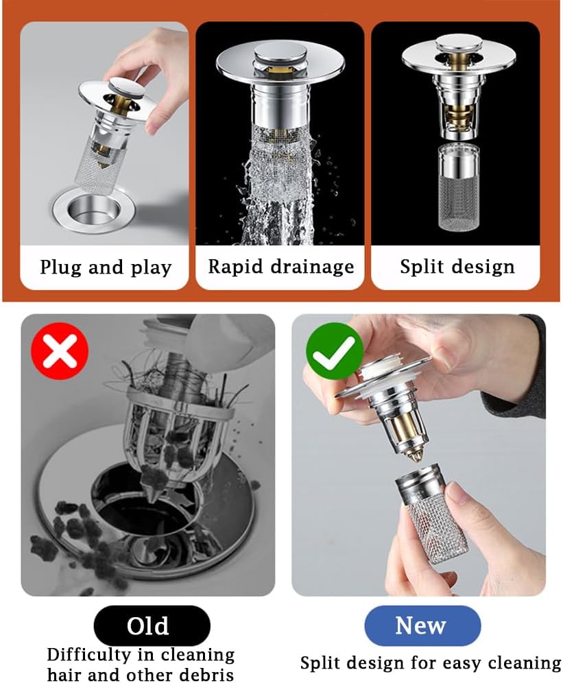 - Upgraded 2-in-1 Function: The pop-up bathroom sink drain strainer features an anti-clogging basket inside, combining the sink pop-up stopper and sink filterr into one. This design collects hairs and prevents the drain from clogging, or prevents valuables such as rings that are prone to slipping from falling into the sewer. This helps to maintain efficient drainage and prevents clogging issues.