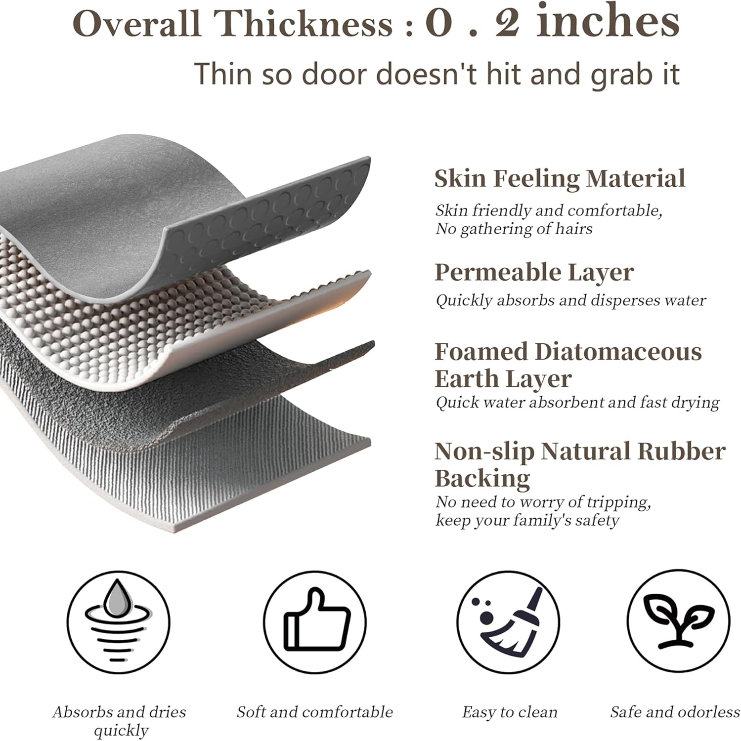 - 【Versatile Usage】This thin bathroom mat is designed to fit under the door and can be used in various settings. Whether in the bathroom rug runner, kitchen mat, laundry room, vanity, sink, hallway, or RV mat, this diatomite stone bath mat adds a stylish and functional touch to any space.