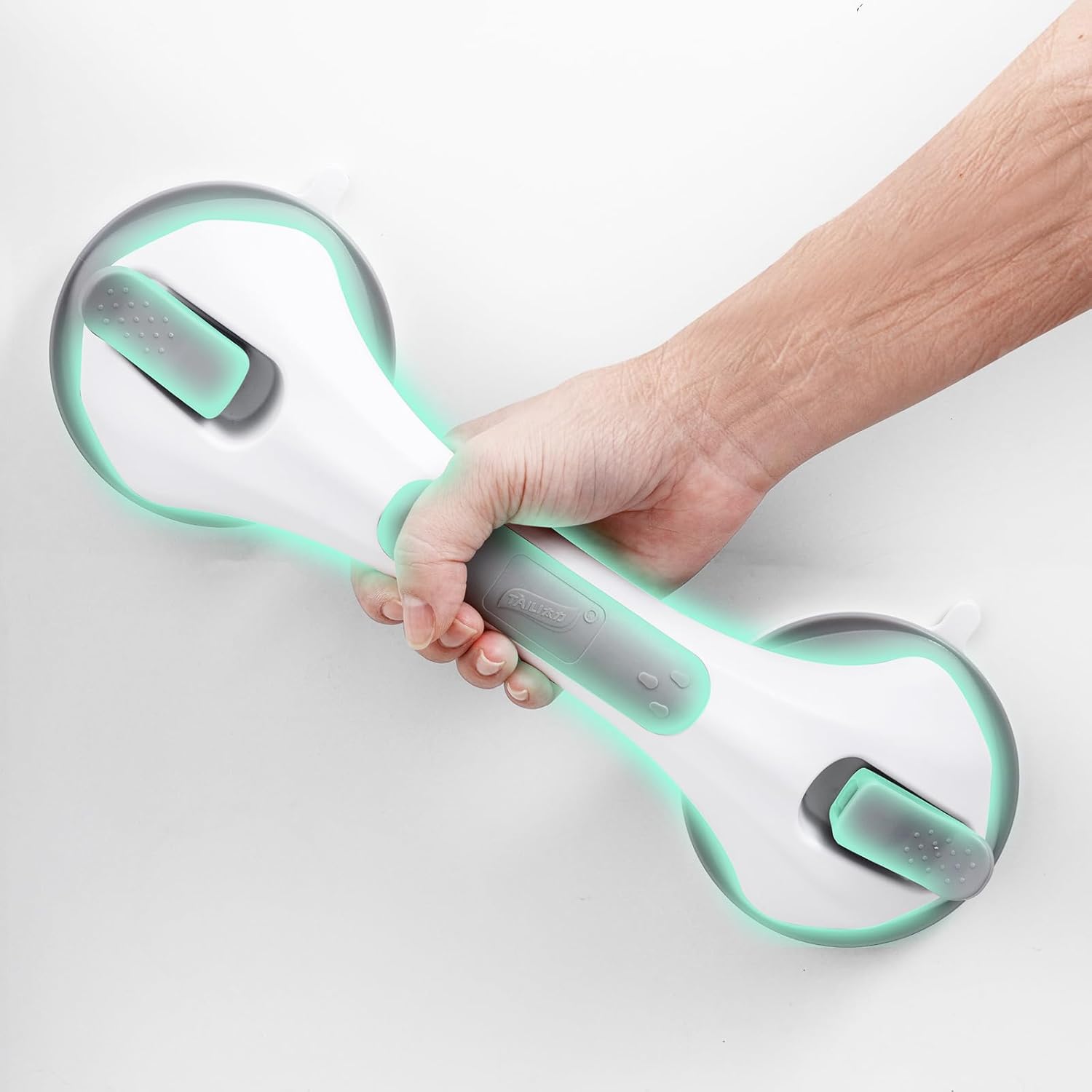 - 24/7 Protection: This suction grab bars have glow in the dark design that makes it perfect for the night. The suction cup shower handle equips 2 Strong suction cups with locking latches to provide stable protection.This shower grab bar has a widened handle so you can more easily hold the handle. When you get up from the shower, the luminous grip shower handle will get lit up in the dark and helps you stand firm in the dark, create a safty atmosphere in your house