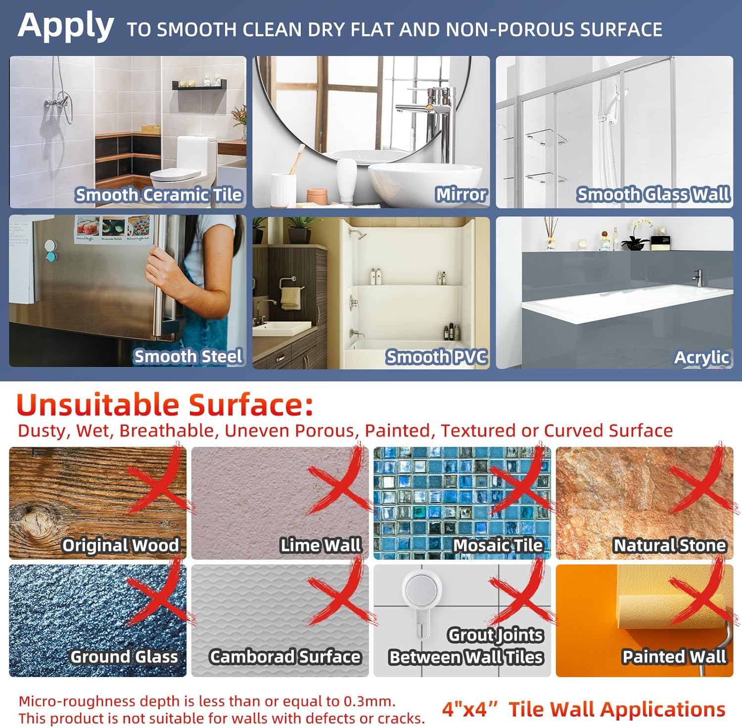 - Warm Tips: Please install this suction grip handle in place and whether it is firm enough before using, pay attention that the suction grab bars for shower ONLY sticks on the impervious and smooth surface, such as Glass, Ceramic Tile, Smooth Marble, Solid Wood Wall, Acrylic Board ect. To make it glow, simply place the shower handle in direct sunlight or under a bright light source during the day. DO NOT install this suction cup grab bar on the crack surface or the porous surface. Please don't put all the body on the shower grip