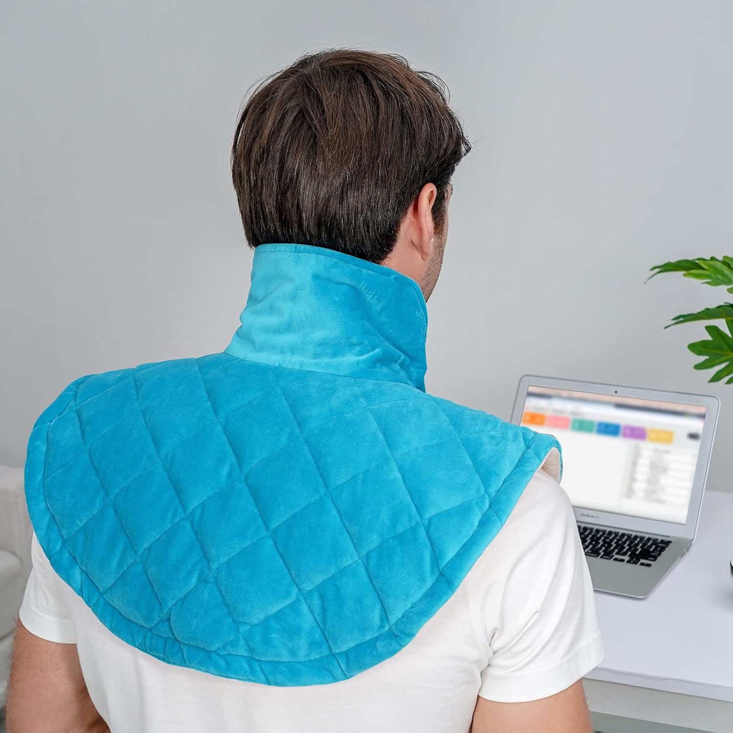 - ăWeighted Designă: Neck and shoulder heating pad is filled with micro-glass beads, which are evenly distributed in the inner of the heating pad. It will fit your neck and shoulders better. Weighted heating pad ensure the heats to penetrate effectively, It effectively relieves neck, shoulder, and upper back pain, eases muscle tension and soreness. Also, it can be applied flexibly to the abdomen and waist to help relieve period cramps.