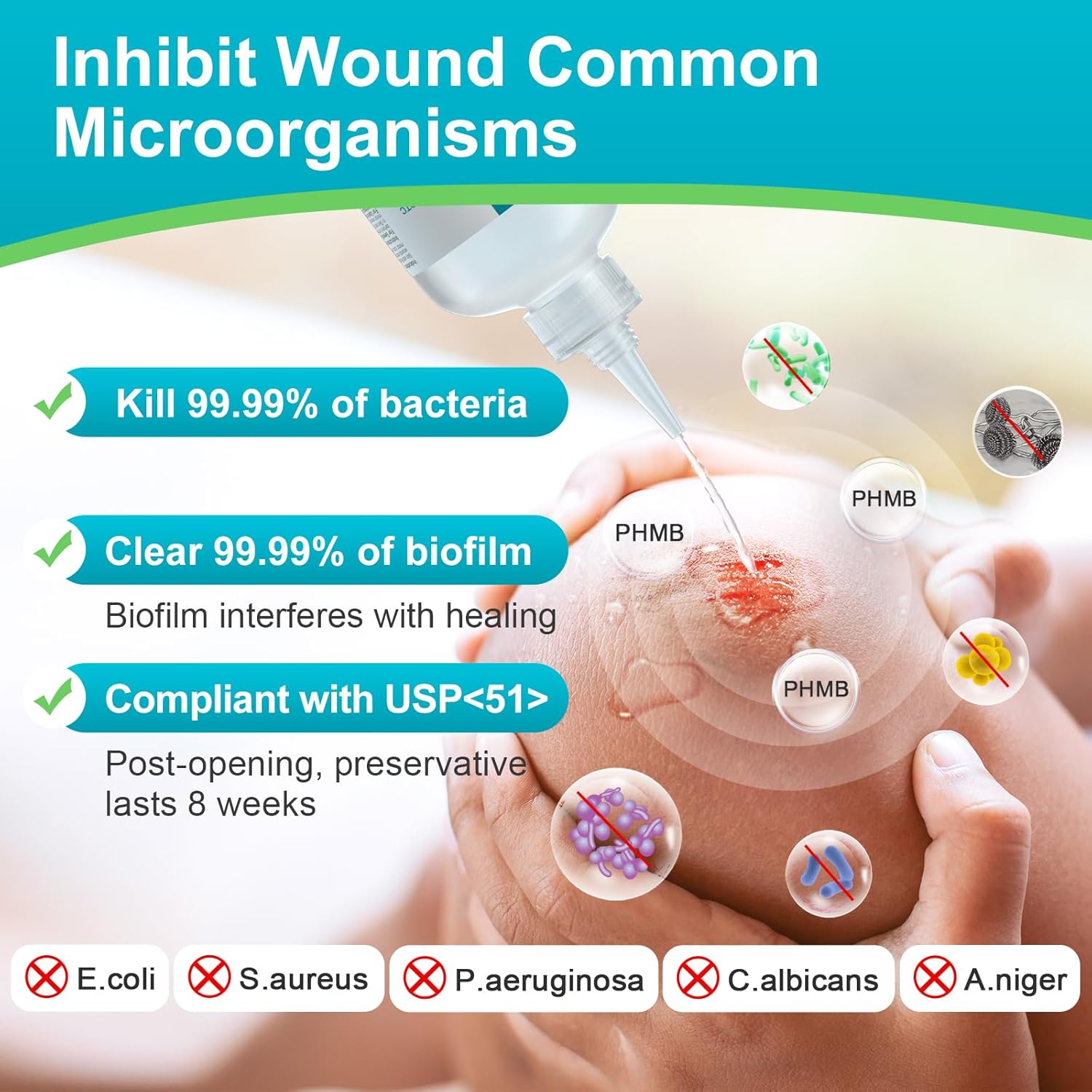 - Broad-Spectrum Antimicrobial Protection: The active ingredient PHMB can effectively targets and destroys MRSA, E. coli, Pseudomonas aeruginosa, yeast, herpes simplex virus, and other microorganisms. Helps remove and prevent biofilm formation, reducing the risk of wound infections. Even on already infected wounds, it demonstrates exceptional germ-killing capabilities, eliminating 99.99% of microorganisms within 2 minutes