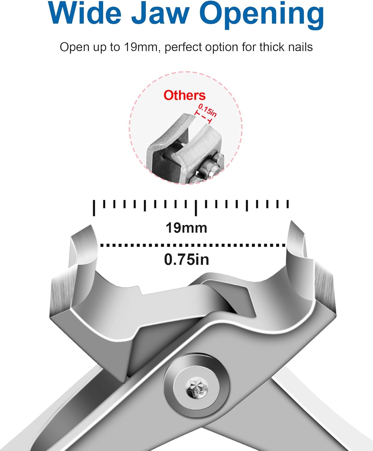 - Wide Jaw Opening: Strong and Sharp blades toenail clipper long handle have 19 mm wide jaw opening, which is great for thick or ingrown toe nails; The fingernail clipper adopts an innovative lever design that reduces the pressure required to cut your nails