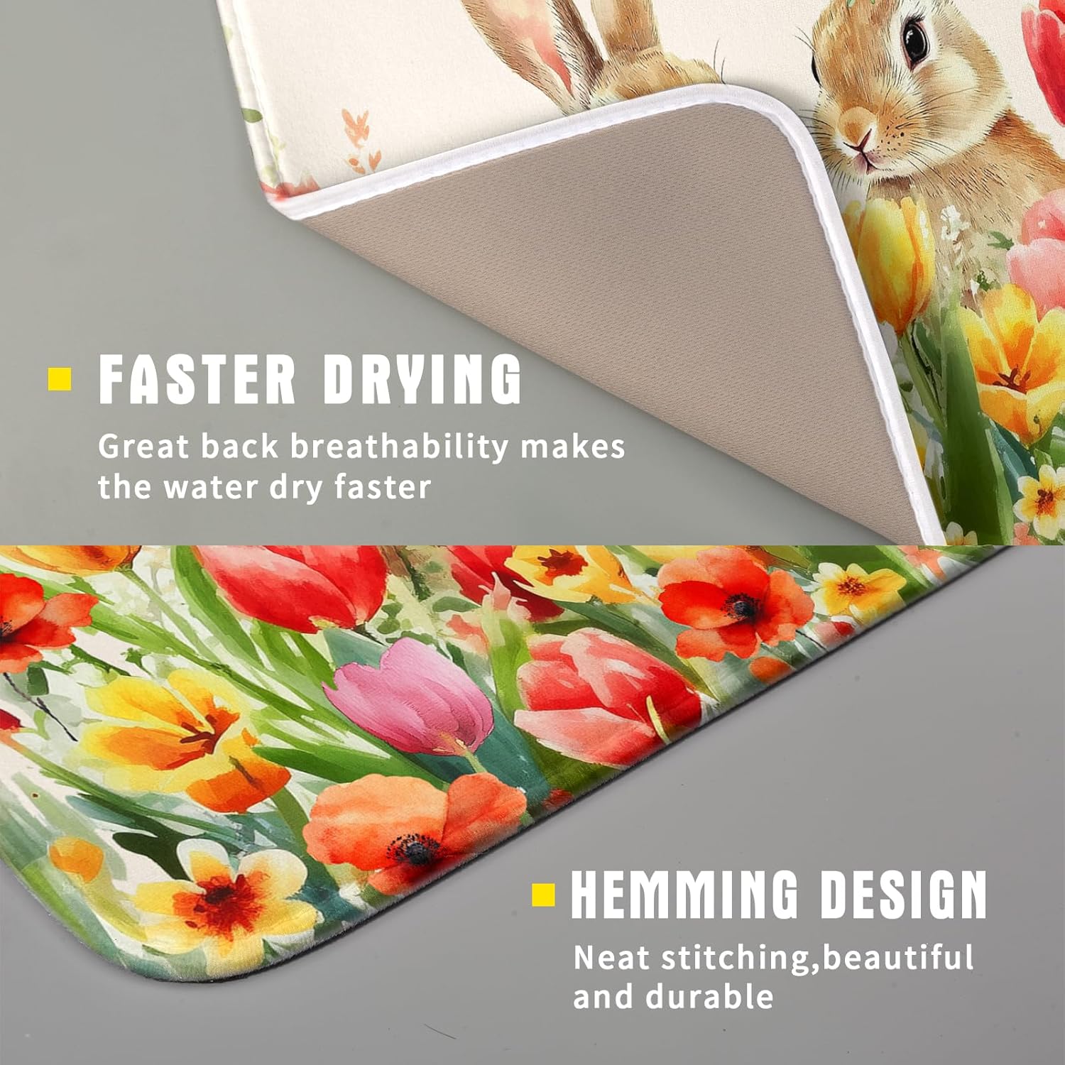 Easter Bunny Dish Drying Mat 16x18 inch Spring Floral Drying Pad Holiday Absorbent Microfiber Dishes Drainer Protector for Kitchen Counter