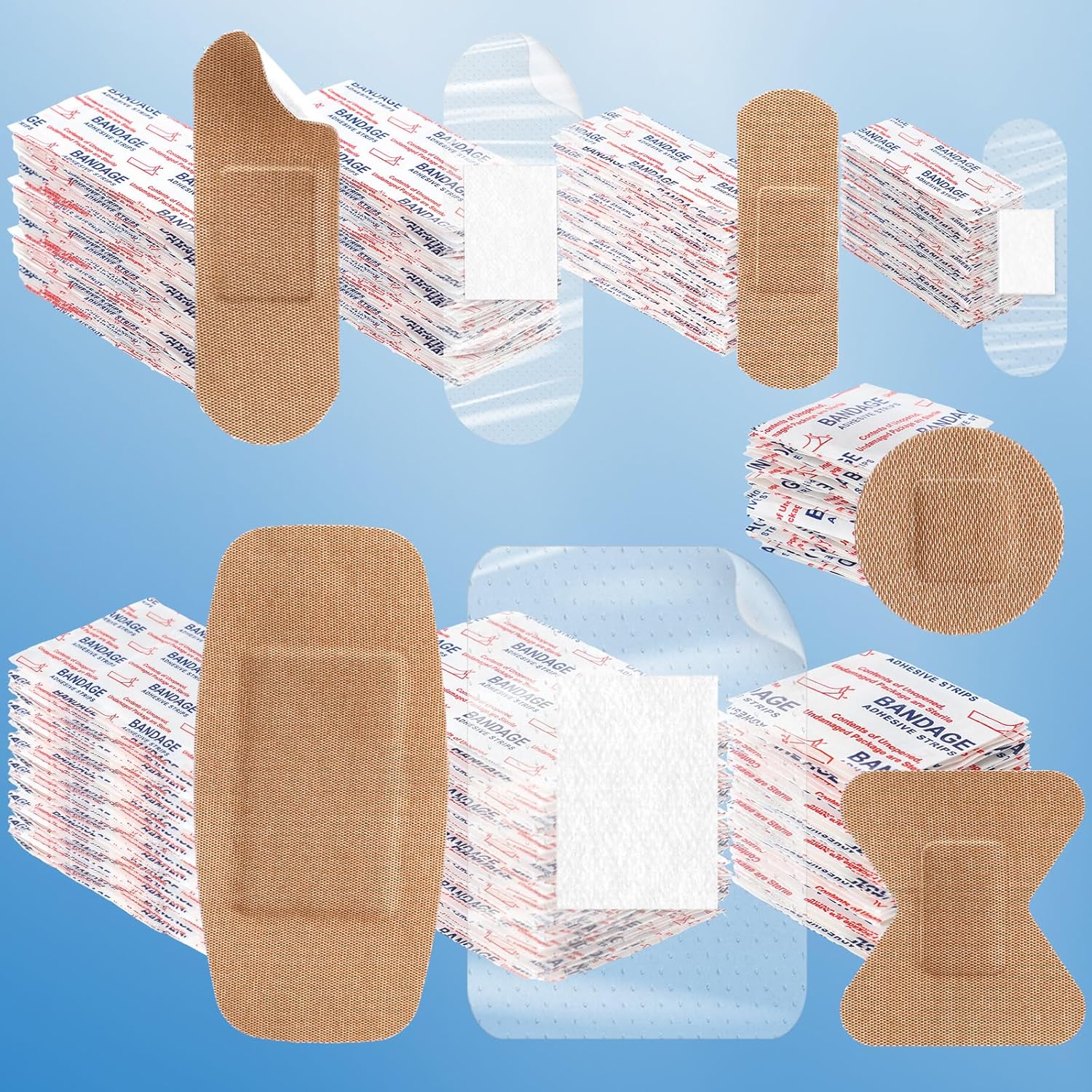 - Various Styles: 20 pcs 3 x 2 inch rectangular transparent bandages, 40 pcs 1 x 3 inch transparent bandages, 40 pcs 0.75 x 2 inch transparent bandages, 20 pcs 4 x 2 inch fabric bandages, 40 pcs 0.625 x 2.25 inch fabric bandages, 40 pcs 2 x 1.75 inch fabric bandages, 50 pcs 1 x 3 inch fabric bandages, 50 pcs 1 inch diameter round fabric bandages