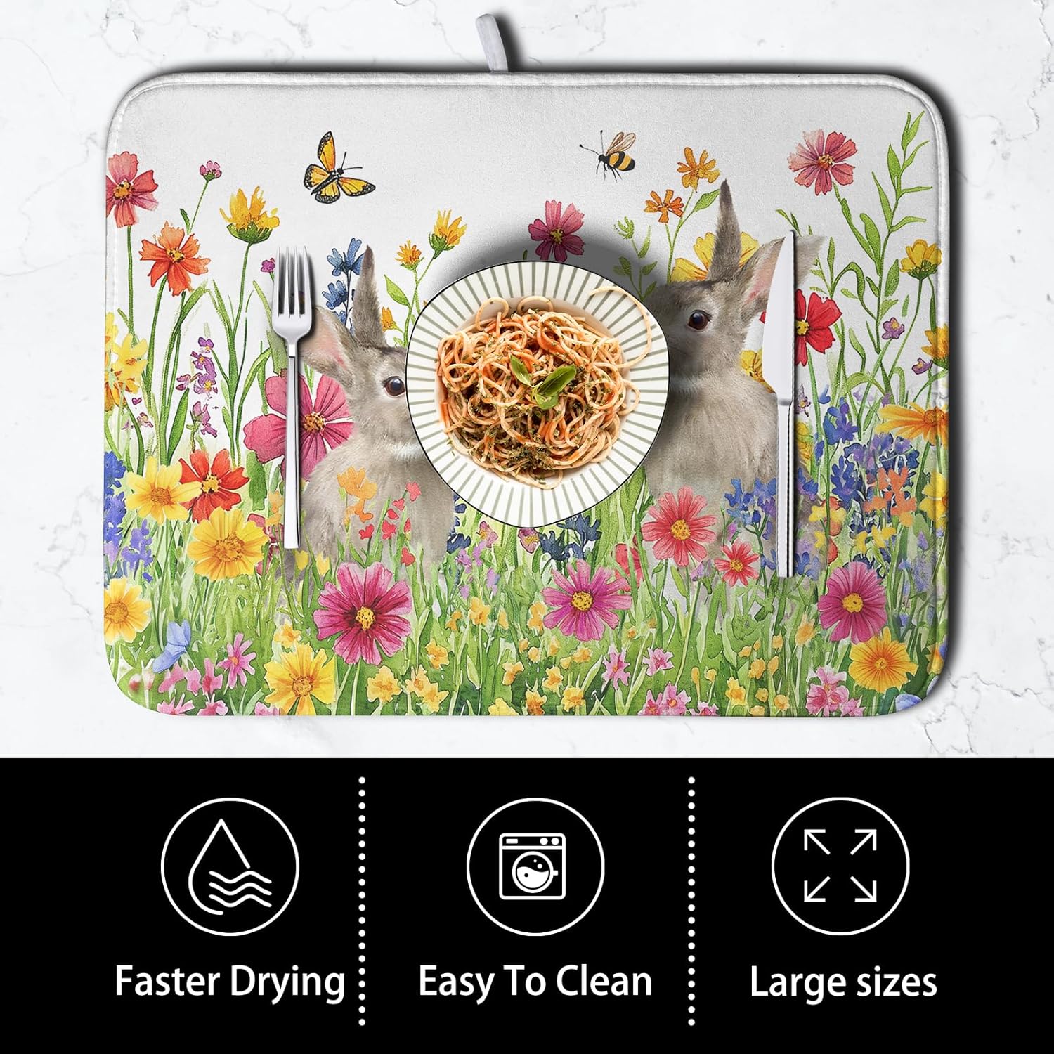 Easter Dish Drying Mat for Kitchen Counter Easter Bunny Flowers Dish Drying Pad Spring Rabbit Floral Dishes Drainer Mats Absorbent Microfiber Kitchen Countertop Protector Drying Mats 18x24 in