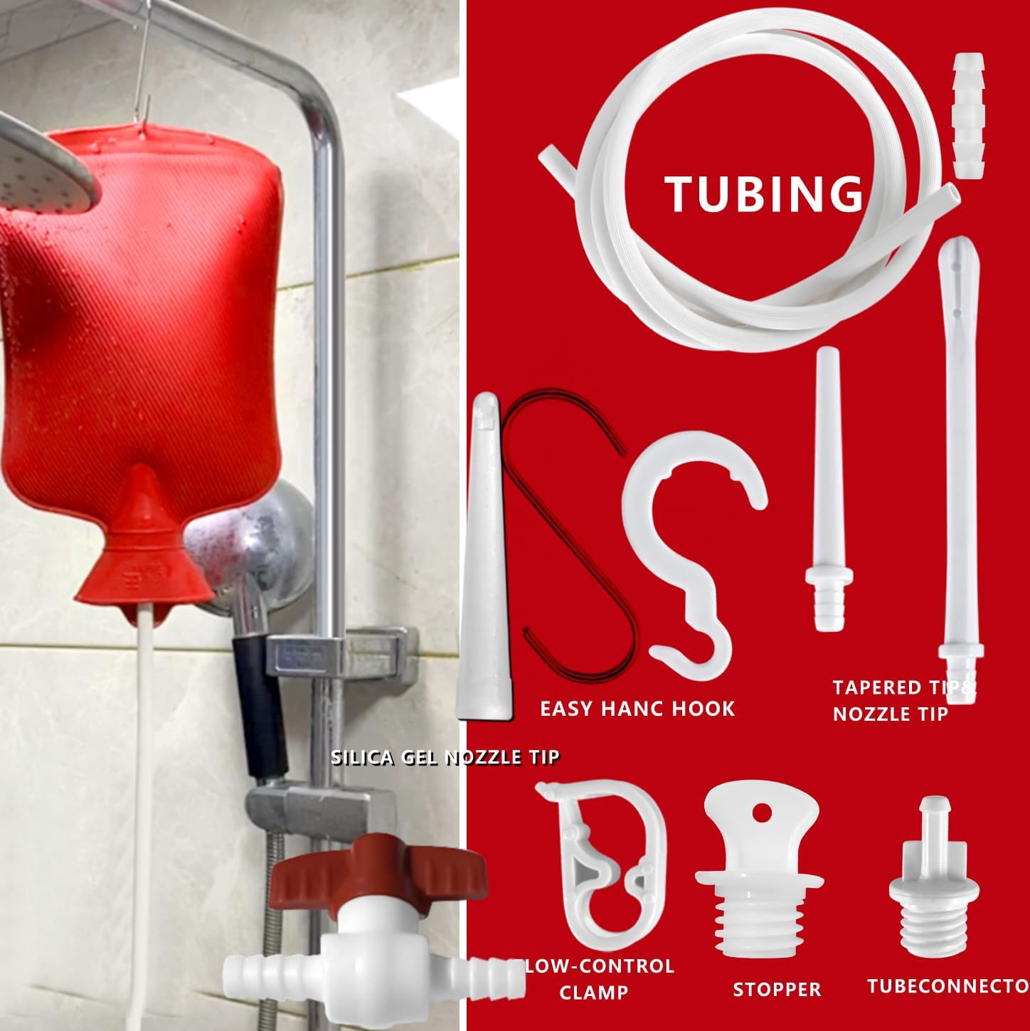 - ENEMA BAG: 2 L enema bag kit with flow-control clamp,60 inch Long Silicone Hose, 1 flow-control clamp,1 switch,3 tips ,2 hooks