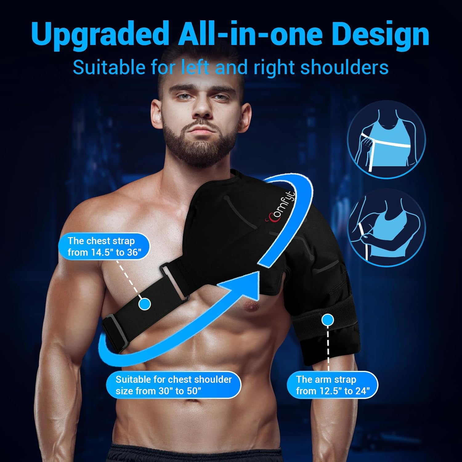 - SHOULDER ICE PACK WRAP: This ice pack is specially designed for the shoulder rotator cuff. Shoulder cold pack wraps around the shoulder, bicep, tricep, arm, and fastens to the upper body with a strong removable and adjustable strap which makes this gel injury ice pack a universal fit for hands-free application and a full range of movement. This mojility ice pack can be used sitting, standing, or lying down, great for home or gym use. (Suitable for chest sizes from 14.5" to 36")