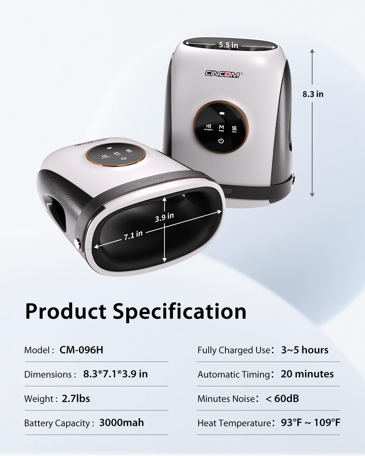 - CINCOM Hand Massager : Multiple Massage Modes to enjoy a variety of customizable settings, including kneading, air compression, and soothing heat to relieve stress and discomfort in the palms, fingers, and knuckles