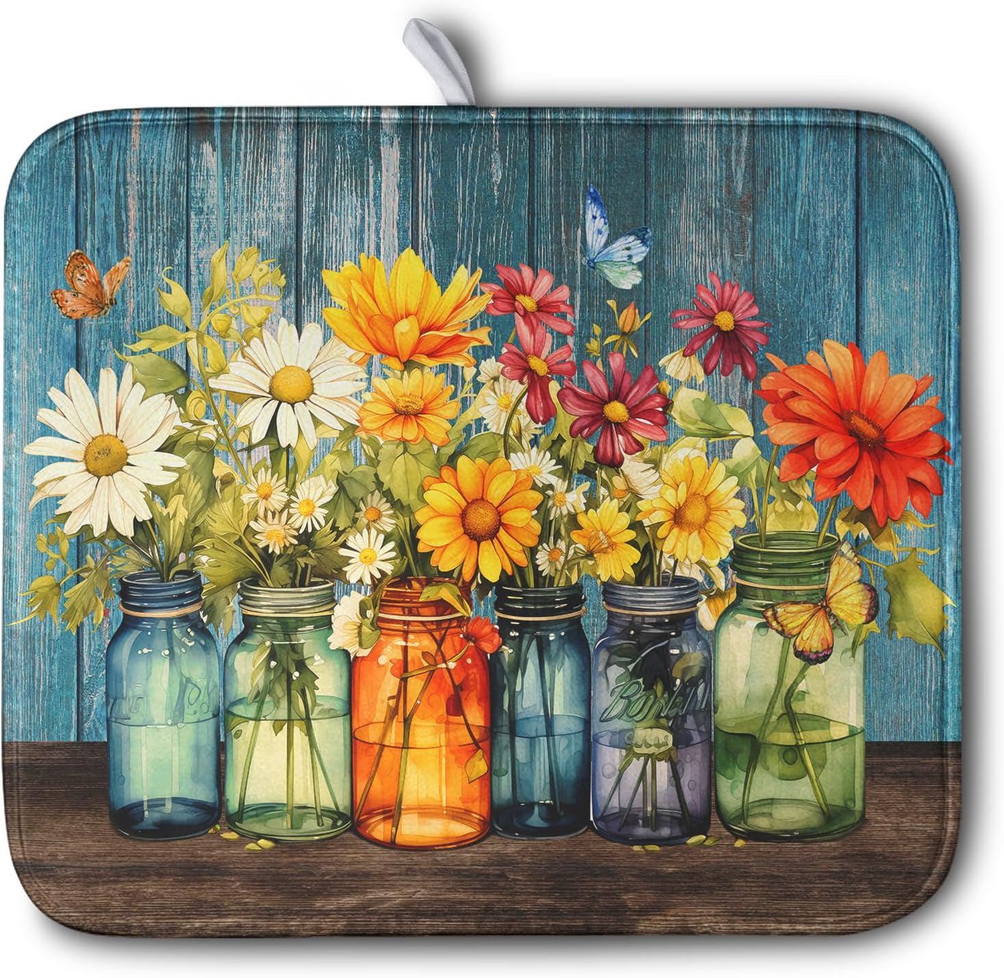 - Multifunctional Pad: Beautiful print on surface side, and reverses to a solid color. The floral mason jar kitchen drying mats absorbs water well, great for air drying dishes, glasses, bottles, silverware, fruits and vegetables, adds stability when drying fragile items