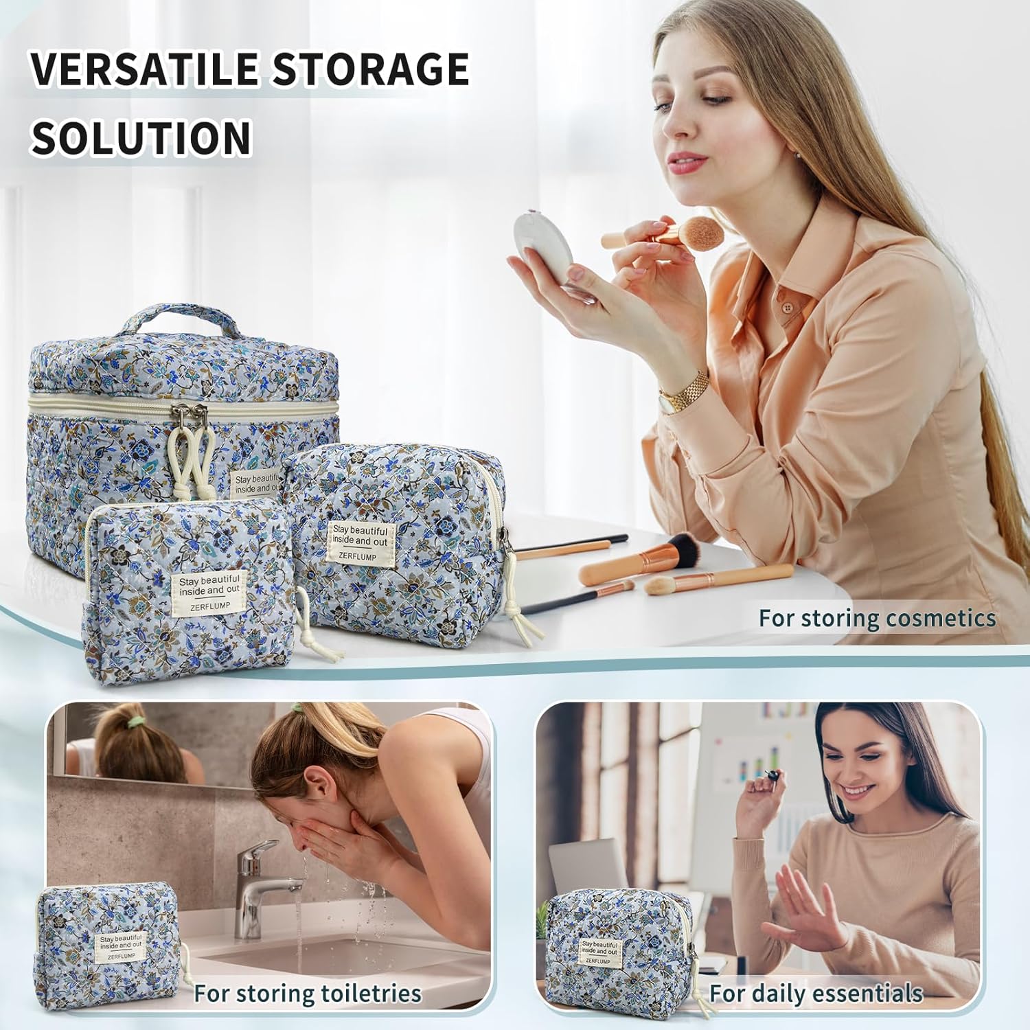 Cute Quilted Floral Makeup Bag(3Pcs),Coquette Aesthetic Cosmetic Bag,Travel Toiletry Bags, Kawaii Aesthetic pouch for Women (62-BlueVine)
