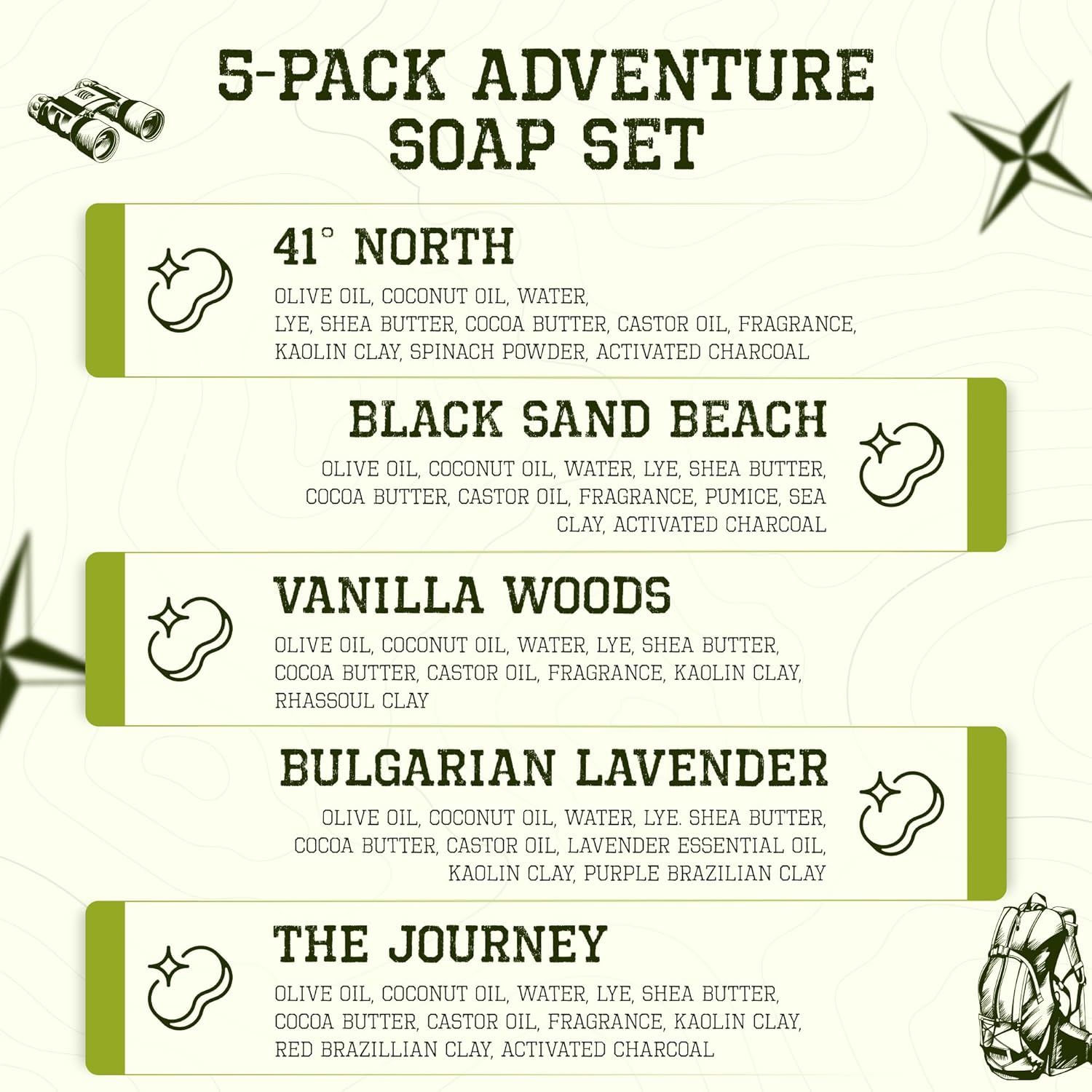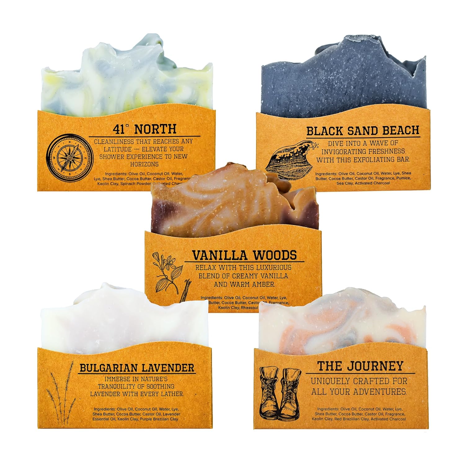 - SCENT VARIETY: Elevate your grooming with a mix of bold scents in our variety pack, featuring 41Β° North, Black Sand Beach, Vanilla Woods, Bulgarian Lavender & The Journey. This women and mens body soap bar set is a perfect addition to your daily routine.