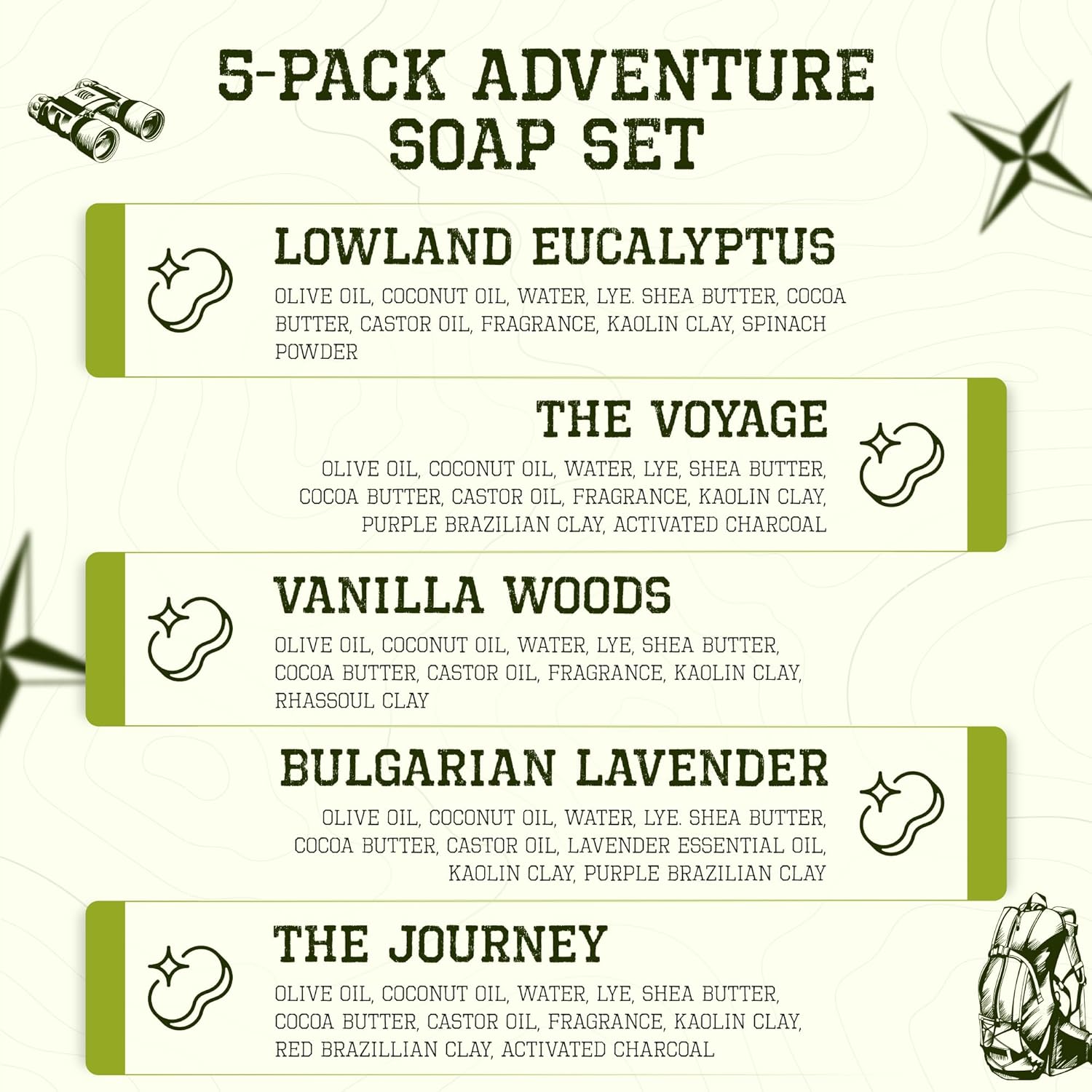 - SCENT VARIETY: Elevate your grooming with a mix of bold scents in our variety pack, featuring Lowland Eucalyptus, The Voyage, Vanilla Woods, Bulgarian Lavender & The Journey. This women and mens body soap bar set is a perfect addition to your daily routine.