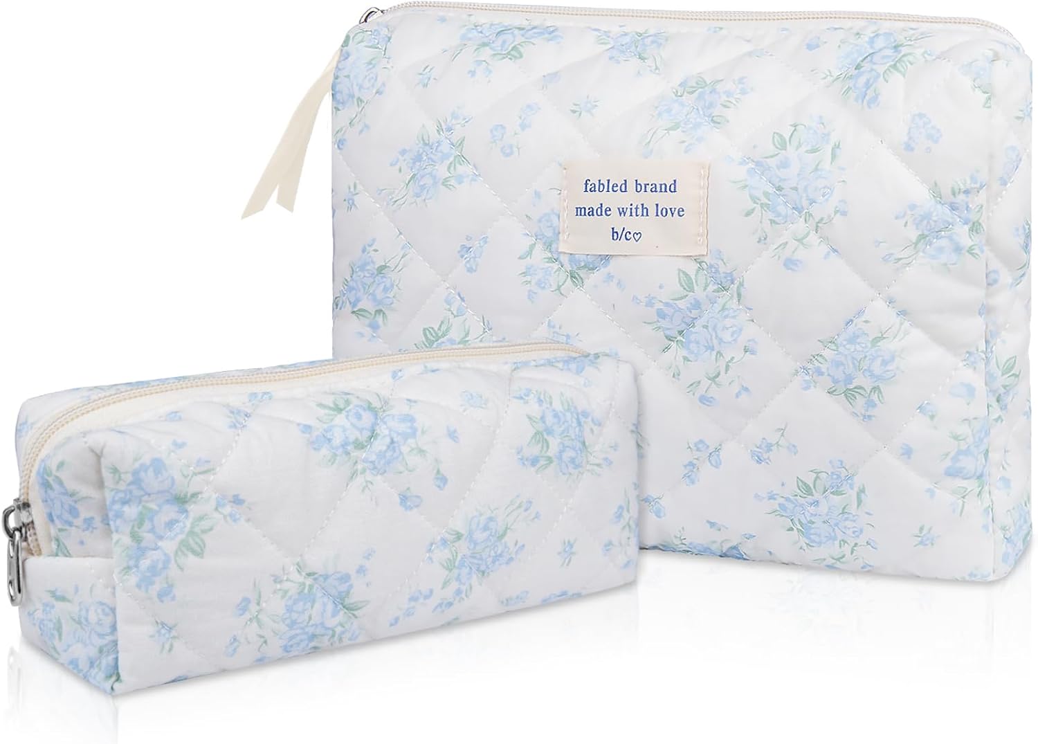 2PC Makeup Bag Set, Cute Cosmetic Bag for Women Girls, Floral Coquette Aesthetic Toiletry Bag, Travel Make Up Organizer Bag (Blue Rose)