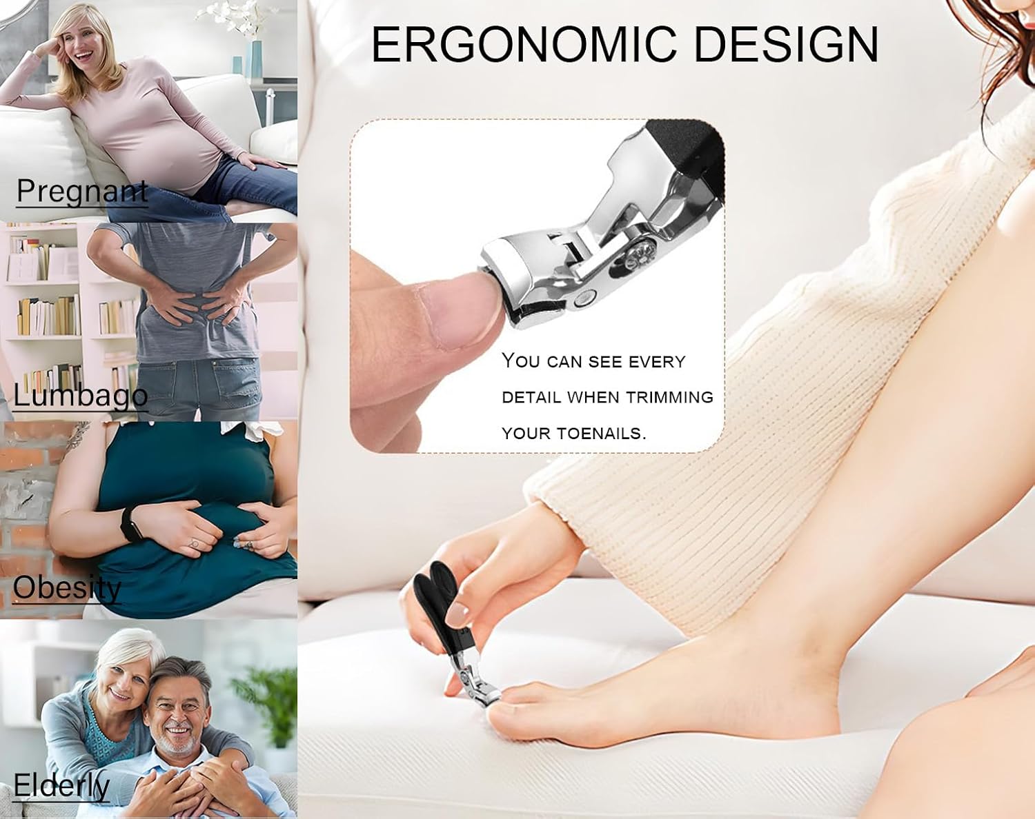 - ERGONOMIC: Fotiwesd toenail trimmers are unique. The angle design for the thick toenail clipper makes it easy to cut toenails and works like the nail clipper with catcher to avoid the clippings everywhere .The Fotiwesd toenail clipper can help to reduce the need for uncomfortable bending. It is the best toenail cutter for the pregnant,eldly,lumbago and obese people.