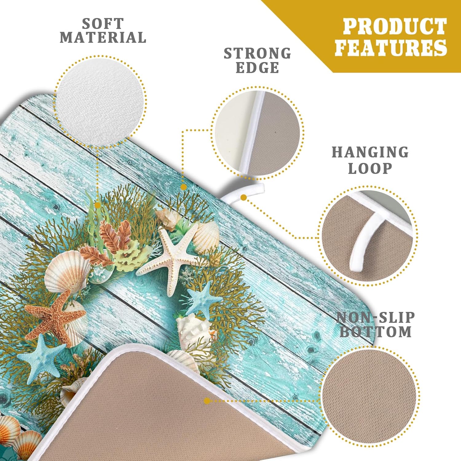 Coastal Wreath Dish Drying Mat 16x18 inch Starfish Shell Absorbent Microfiber Dish Rack Mats Drainer Pad Kitchen Countertop Accessories