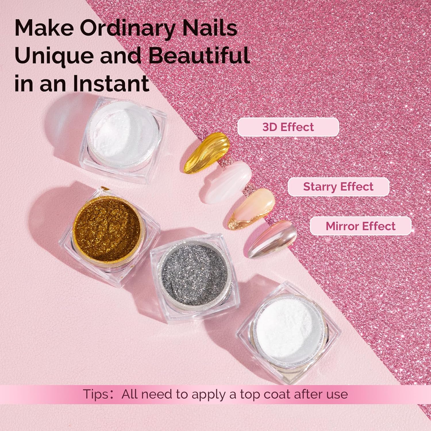 - Wide Range of Applications: Suitable for UV gel nails, acrylic nails,natural nails or false nails.Easy to get a salon grade chrome effect without special techniques.Powder is easy to apply and suitable for beginners