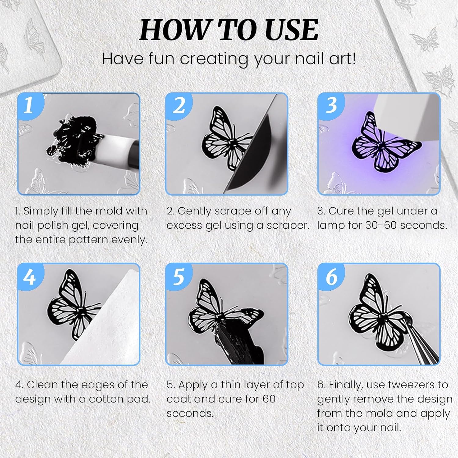 - 【Easy to Use】It is compatible with regular nail polish gel. Simply fill the mold with nail polish gel, covering the entire pattern evenly. Gently scrape off any excess gel. Cure the gel under a lamp for 30-60 seconds. Clean the edges of the design. Apply a thin layer of top coat and cure for 60 seconds. Finally, use tweezers to gently remove the design from the mold and cover nails and then seal with top coat.