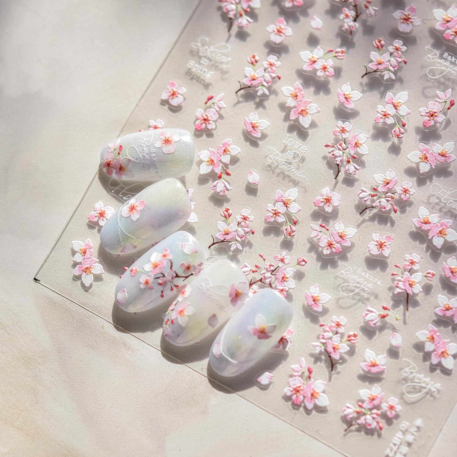 Flower Nail Stickers for Nail Art 5D Self Adhesive Nail Decals Spring Summer Nail Art Stickers White Pink Floral Nail Supplies Manicure Decoration for Women Girls