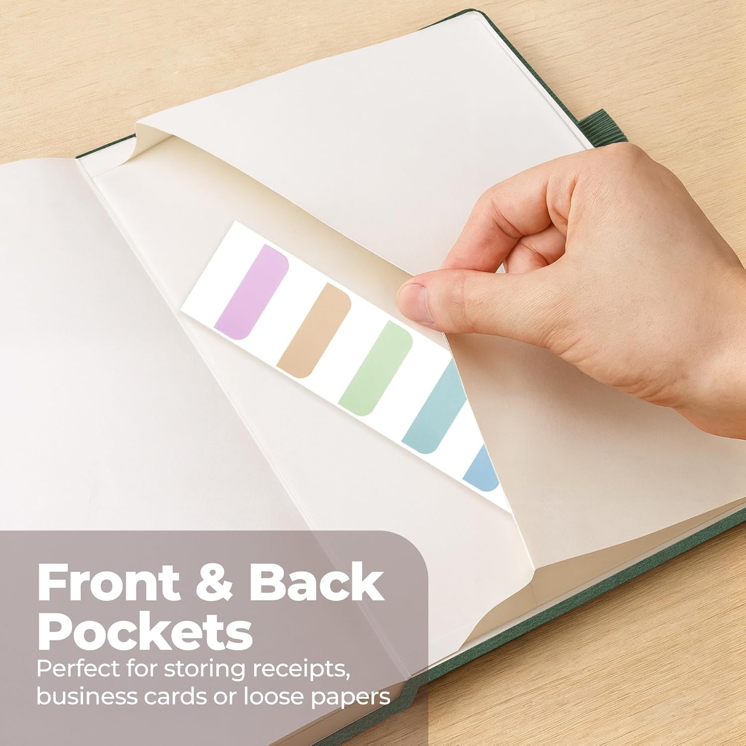- DESIGNED WITH FUNCTIONAL FEATURES – Stay organized with built-in front and back pockets for loose notes or stickers, elastic closure band to keep pages secure on the go, and dual ribbon bookmarks to quickly find important sections. The pen holder means your favorite writing tool is always within reach. And it also comes with free sticky tabs to mark pages, organize sections, and quickly find your most important notes!