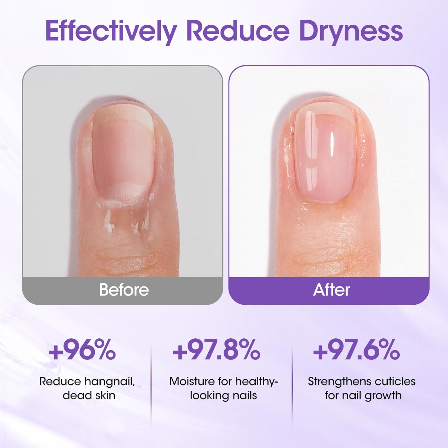 - 【Deep Hydration & Luxury Nourishment】A luxurious blend of organic lavender oil, Vitamin E, Jojoba oil, and silica. Softens dry, cracked cuticles, penetrates and hydrates breaking, thin nails while helping to maintain flexibility and reduce brittleness, and keeps fingertips smooth and hydrated.