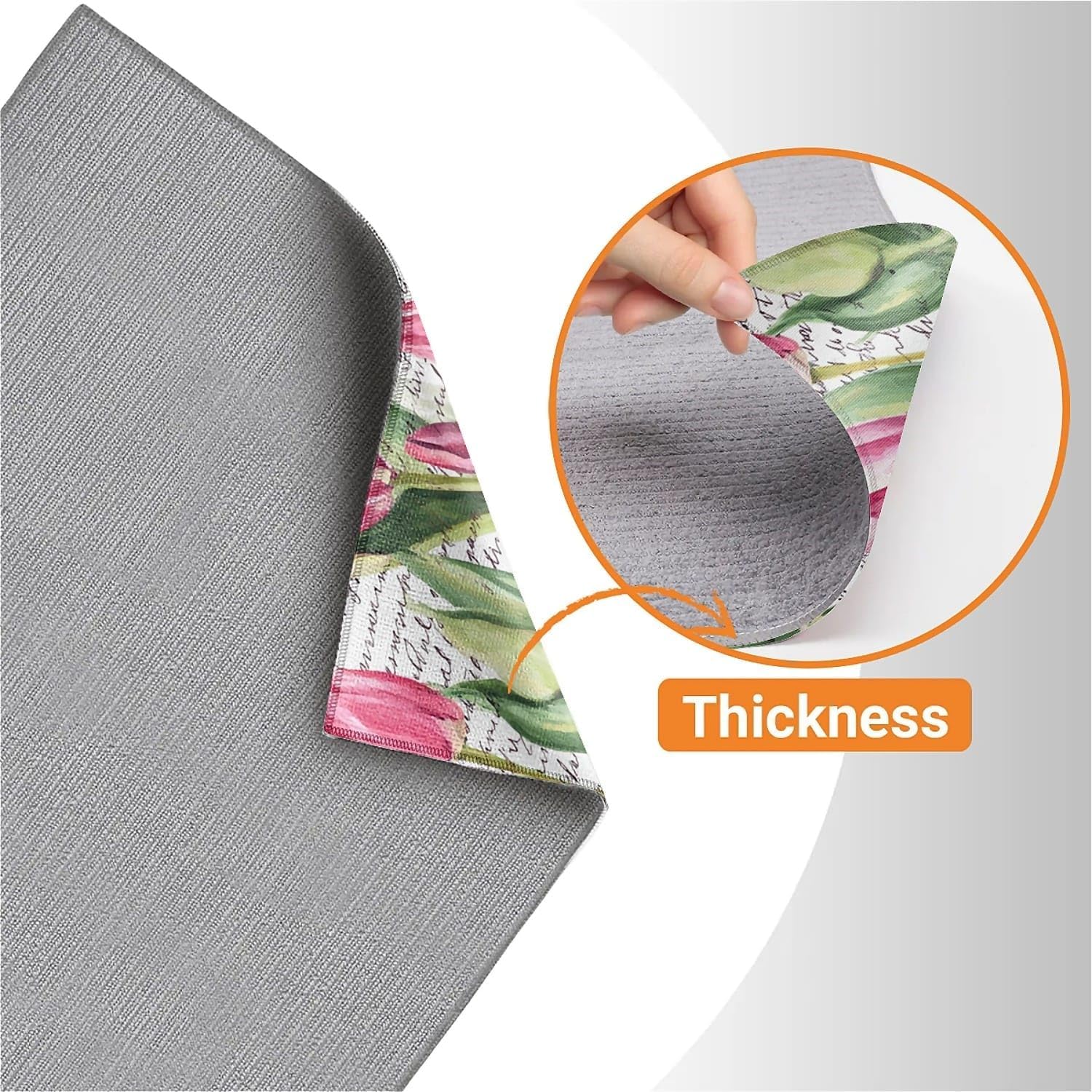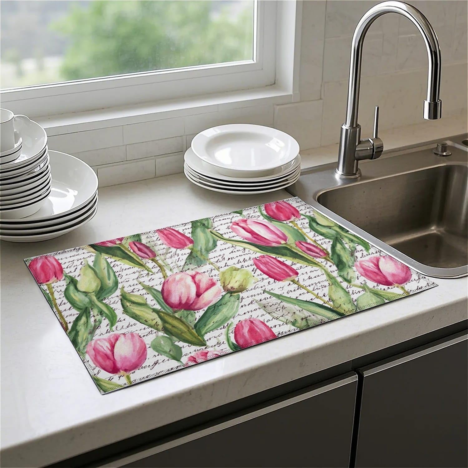Dish Drying Mat For Kitchen Counter, Pink Tulip Flowers Text Microfiber Absorbent Dish Drainer Rack Pad Reusable Large 18x24in Drying Mat