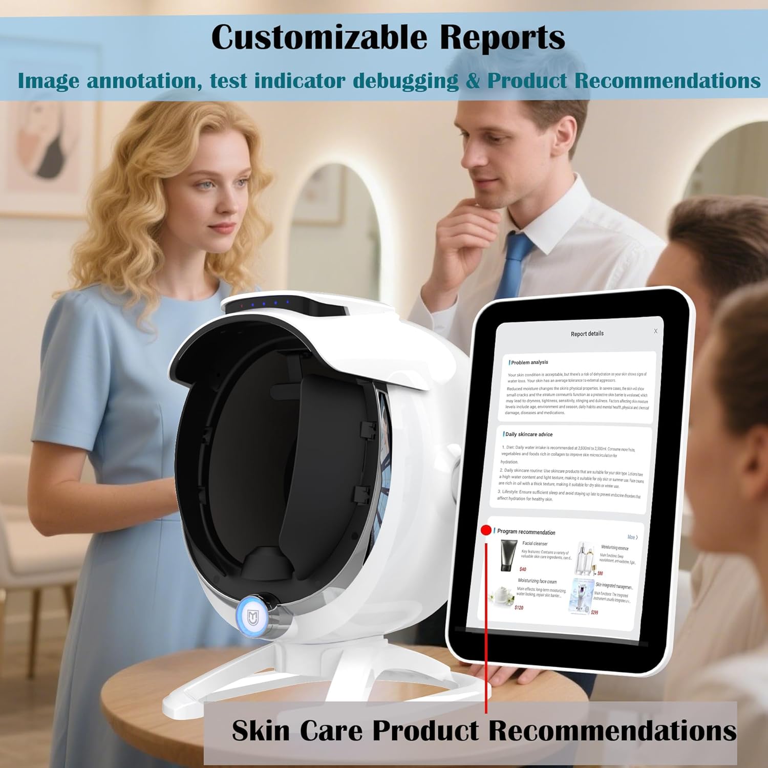 - 15 Skin Health Indicators: Comprehensive analysis of blackheads, redness, fluorescent agents, sebum, wrinkles, and more for personalized skincare recommendations. Quickly analyze skin and generates a test report in less than 15 seconds.