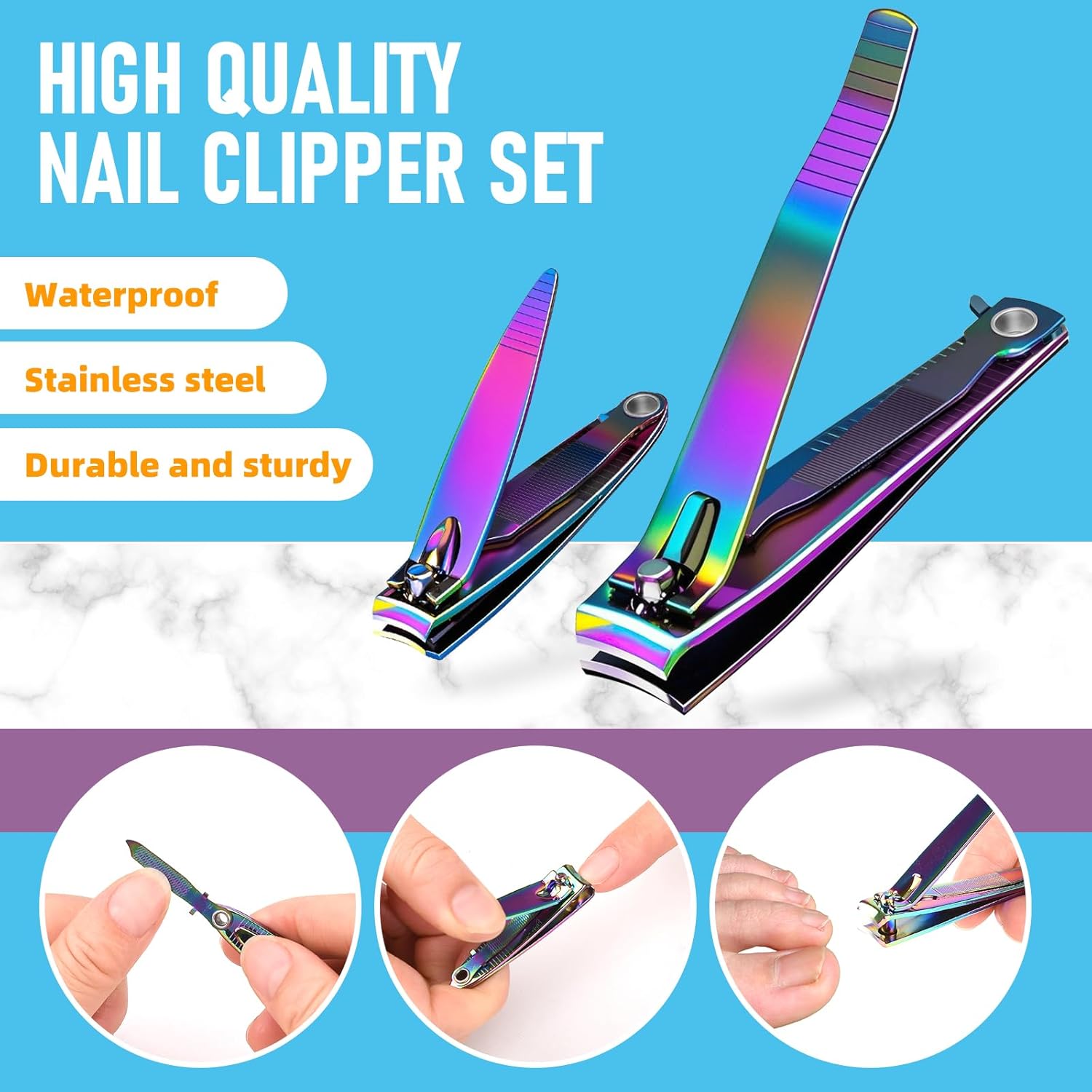 - 【Stylish Nail Clippers】Our fashionable Rainbow Nail Cutters Sets are made of sturdy zinc alloy stainless steel precision blades and anti-skid lever, which are strong, durable and lasting. Stylish Nail Clippers Set is a great gift for your family or friends!
