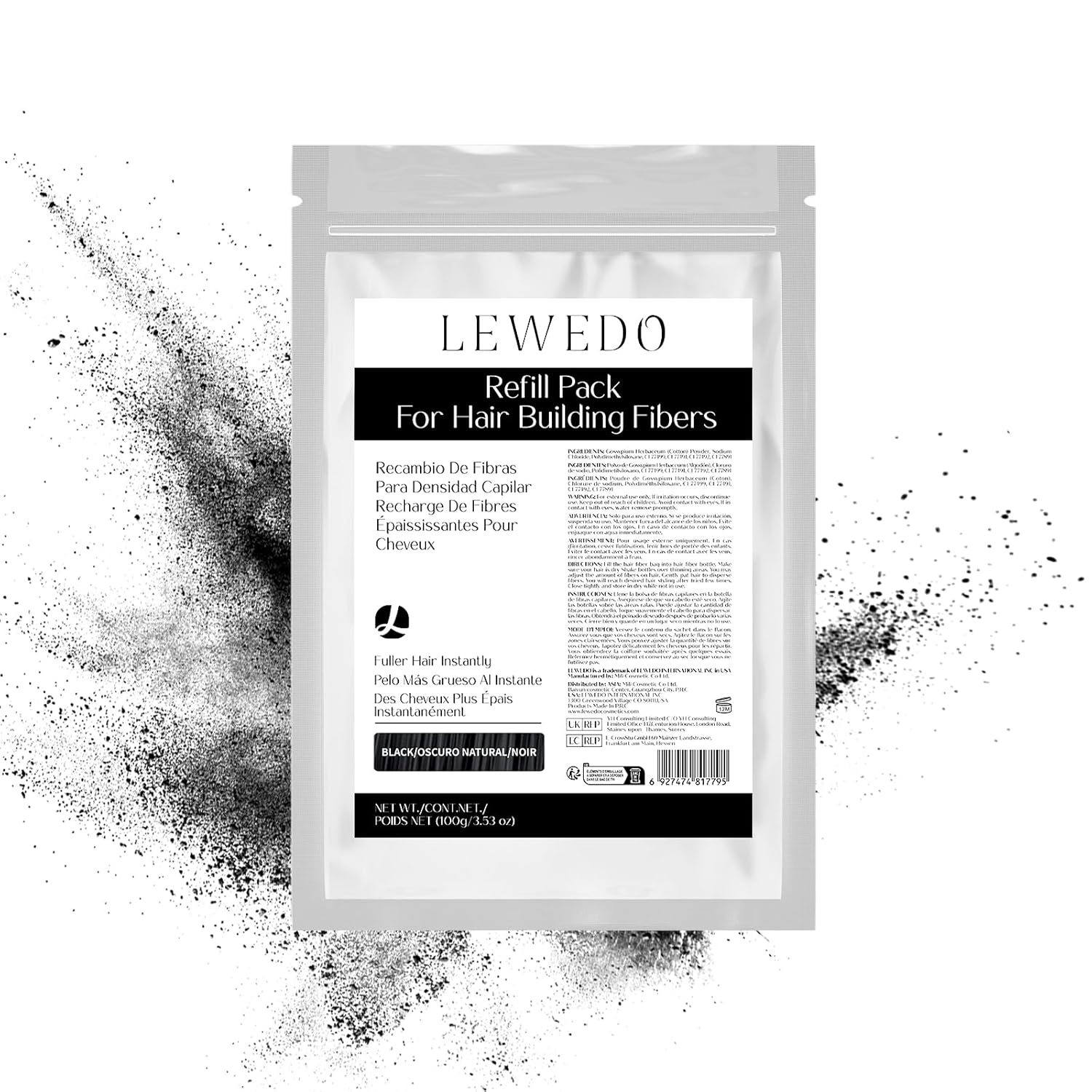 Hair Building Fibers Refill Pack - 100g Instant Thickening Fibers for Men & Women, Natural Cotton Powder, Wind/Rain Resistant, For All Hair Fiber Applicator Bottles (Black)