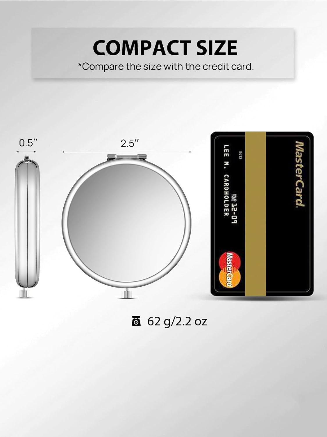 - 1X & 2X MAGNIFICATION: Double-sided purse mirror that meets all your cosmetic needs. The regular mirror is ideal for viewing the entire face closely, while the 2X magnifier works great for mascara, tweezing, plucking, flossing, etc