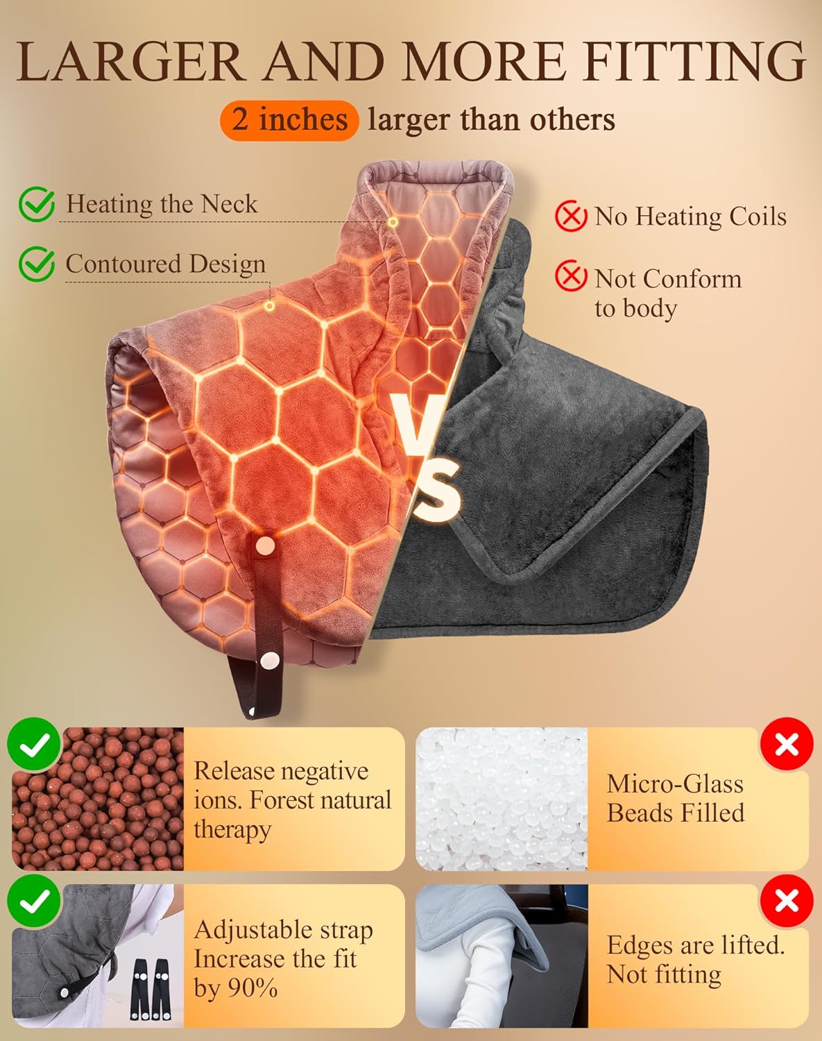 - 【 Larger and more snug than others 】: 20''x 24'', 2 inches larger than the conventional neck heat pad. We increase the coverage area of the neck, making your long neck no longer cold! The design of the gravity and adjustable straps increases the fit by 90% compared to the ordinary neck shoulder heating pad.