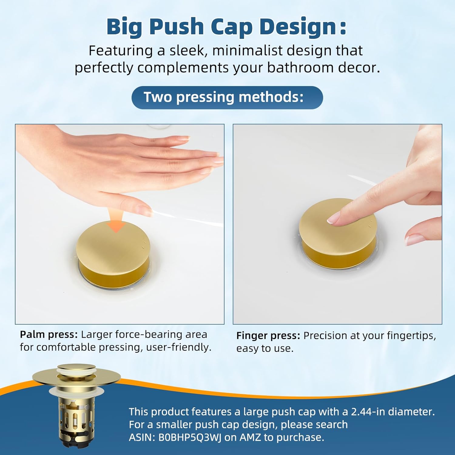 - [Pop-up Design with Big Push Cap] Our sink drain strainer is made of high-quality stainless steel, solid brass, and plastic, providing exceptional rebound strength, corrosion resistance, and long-lasting durability. It features a sensitive pop-up solid brass bullet core, allowing you to easily switch between the water storage and fast drainage with just a gentle press. The large metal push cap has an innovative design that allows both finger and palm pressing for a more comfortable experience