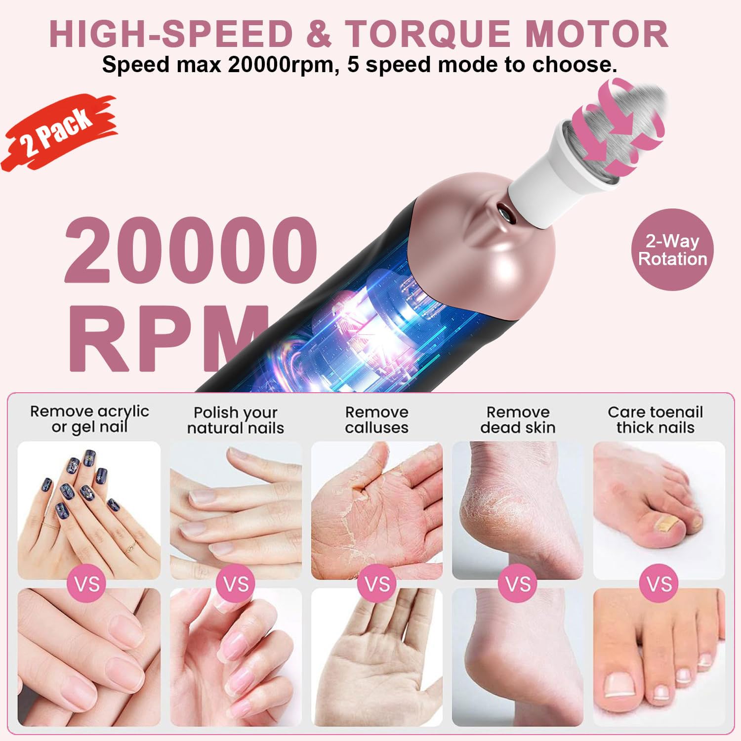 2 Pack All-in-One 9-in-1 Cordless Nail Drill Kit: 100 Bits, 5 Speeds for Perfect Nails at Home & Salon,Black