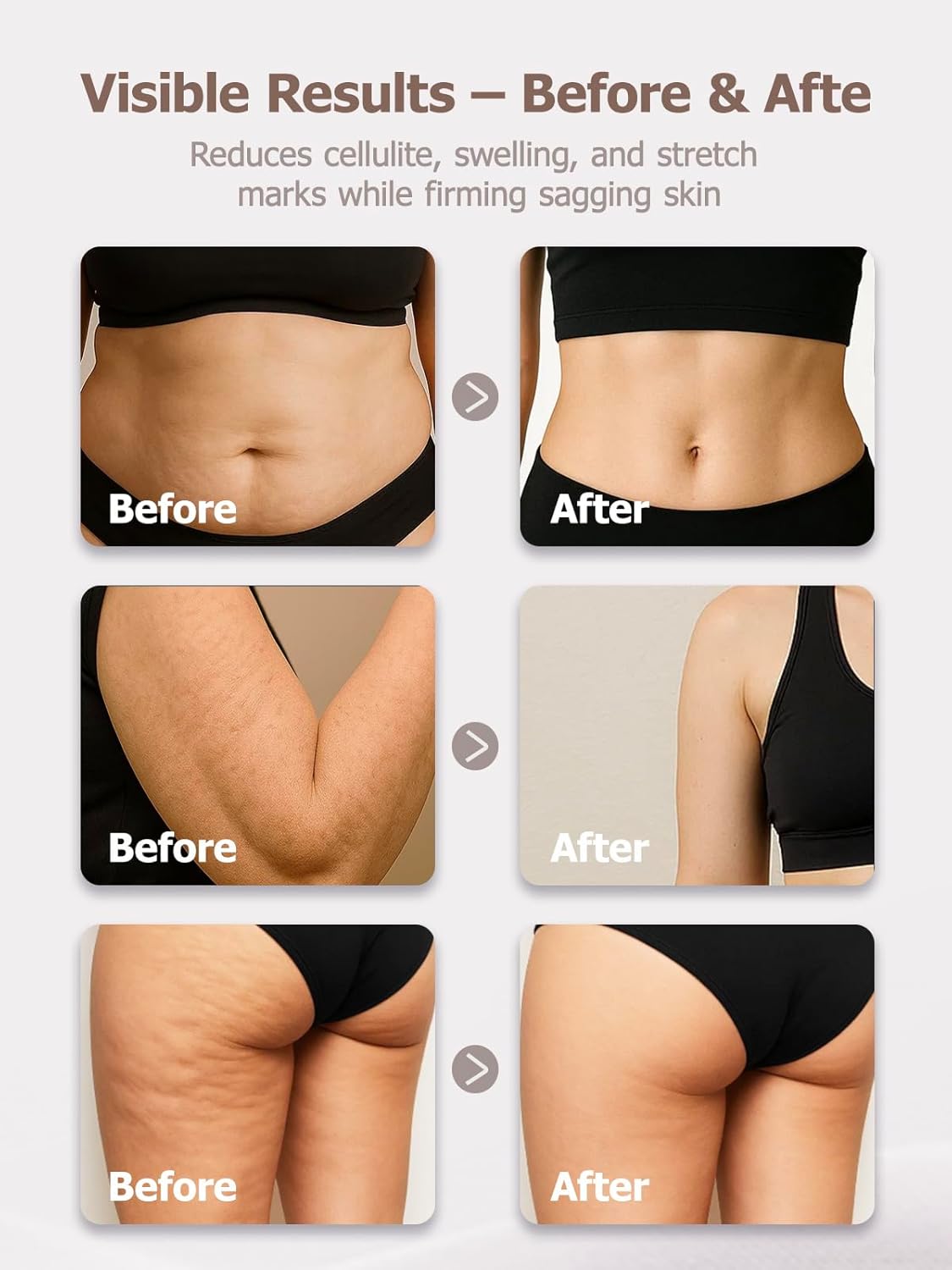 - 4 in-1 Firming Technology – Smooth Cellulite & Stretch Marks Combines microcurrent, light, heat, and vibration to improve circulation, enhance collagen production, and visibly tighten skin. Ideal for use on arms, legs, waist,neck, and stomach.