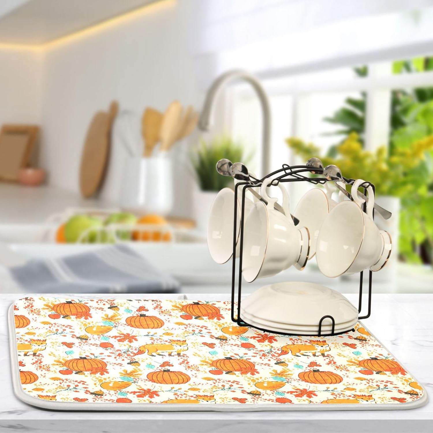 Fall Fox Dish Drying Mat for Kitchen Countertop 16x18 Autumn Chestnuts Pumpkin Berry Thanksgiving Day Small Drying Mat Reusable Quick Dry Dish Sink Mats Easy Clean Decorative Essentials