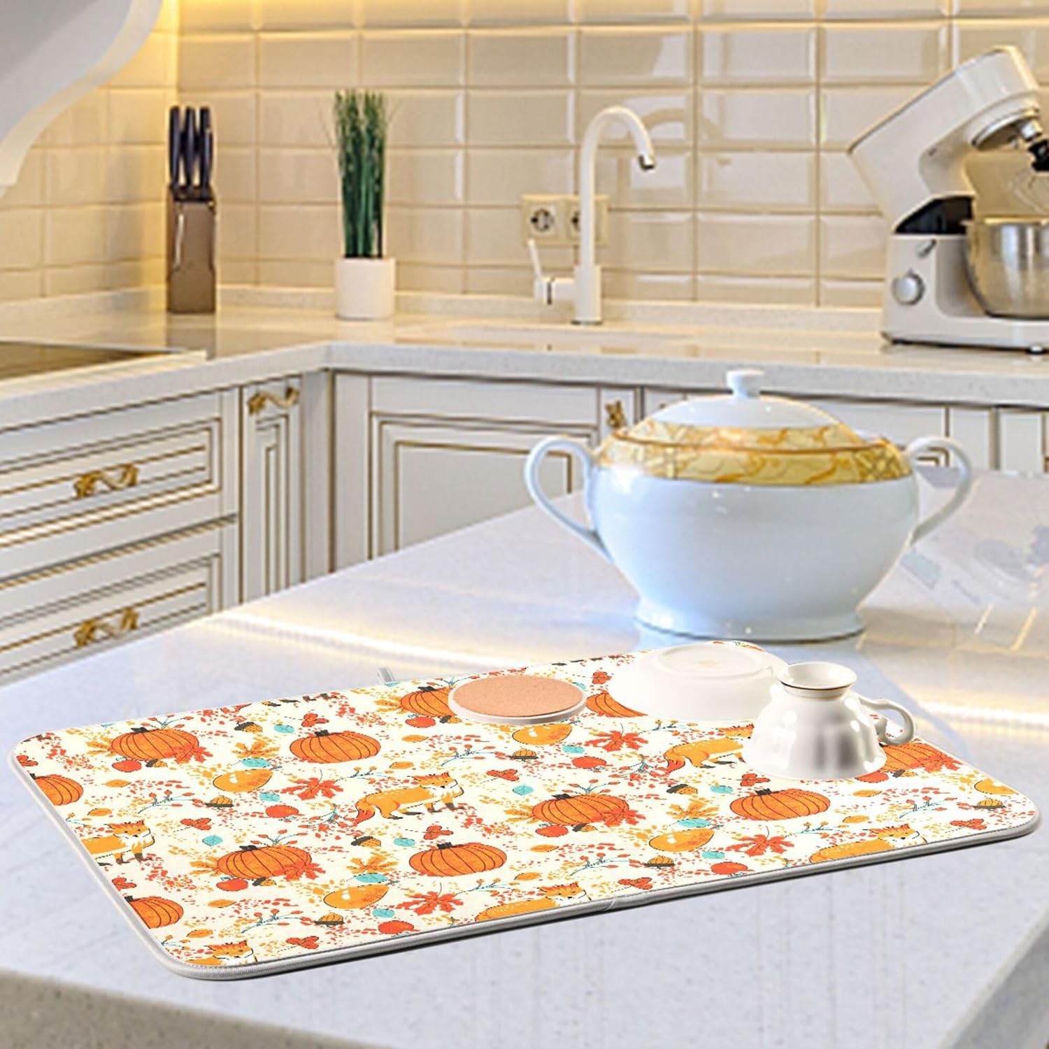 Fall Fox Dish Drying Mat for Kitchen Countertop 18x24 Autumn Chestnuts Pumpkin Berry Thanksgiving Day Large Drying Mat Reusable Quick Dry Dish Sink Mats Easy Clean Decorative Essentials