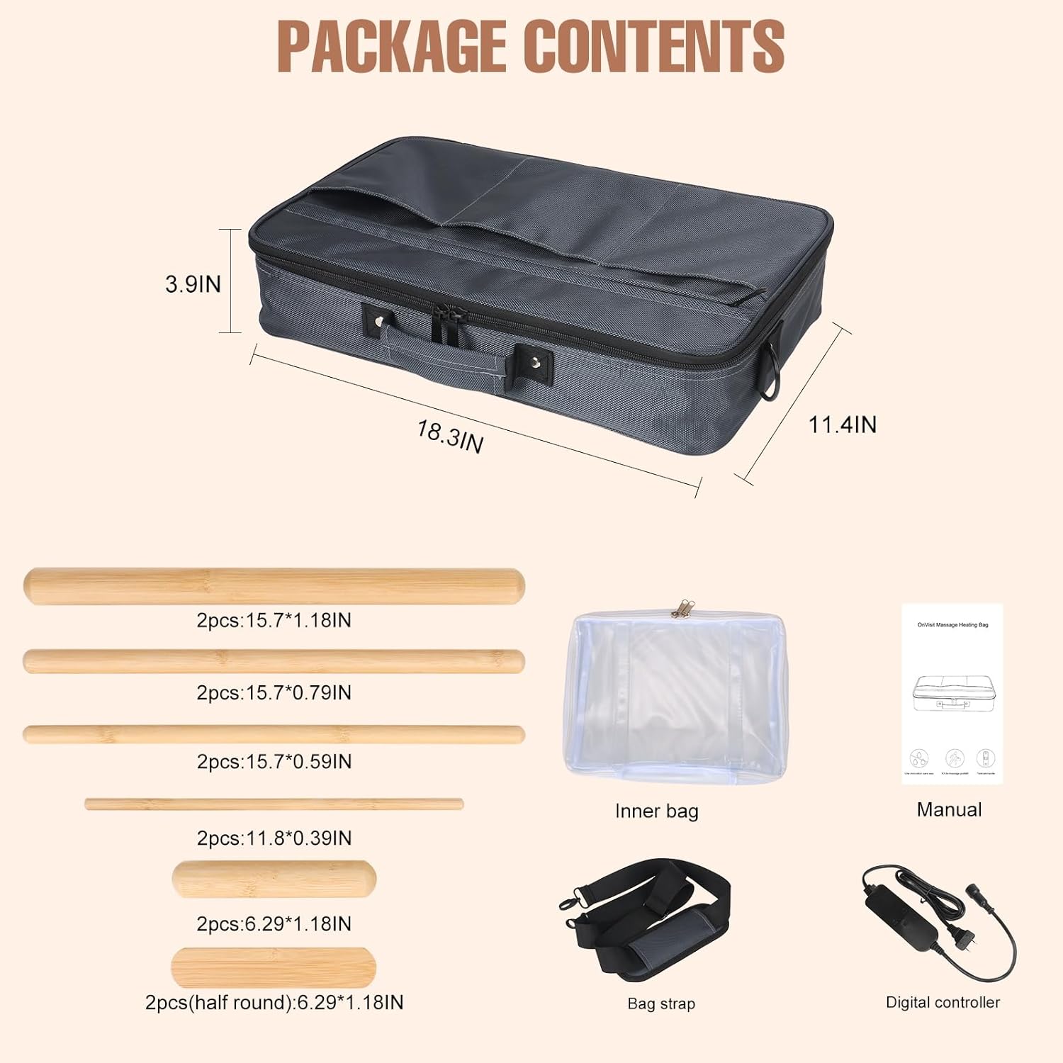 - 【12Pcs bamboo massage sticks】Massage bamboo stick heater, can be used to heat massage stones and bamboo sticks, dry towels, convenient for your various heating and massage needs. Includes: 12 massage bamboo sticks, 1 inner bag, 1 power cord (with digital temperature controller (110V), 1 shoulder strap, and 1 user manual. You can heat dry towels, essential oils, or other heatable massage stones. However, it is prohibited to heat wet towels, and the heating bag must not come into contact with water