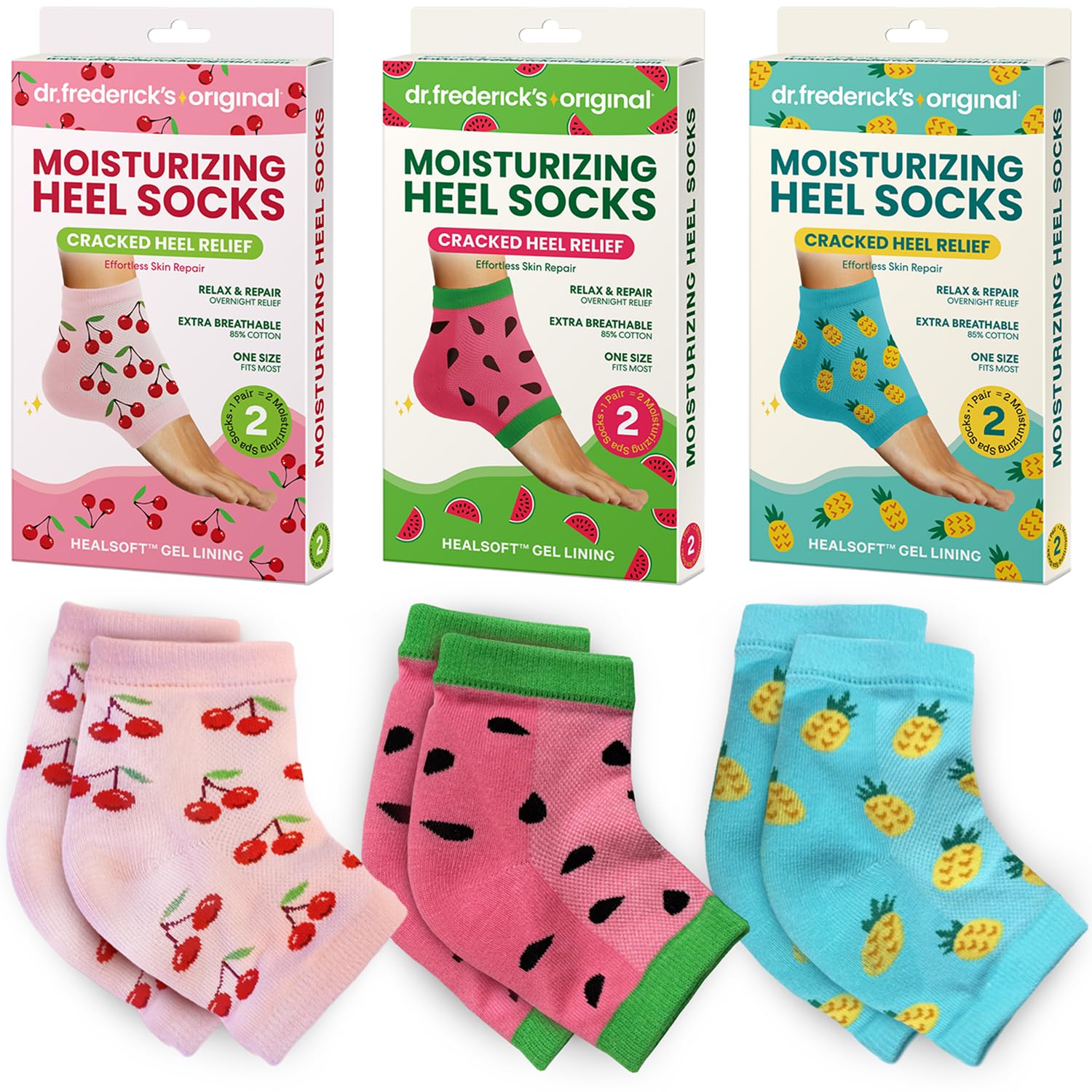 - Fast Cracked Heel Repair for Sandal Season: Dr. Frederick’s Original Moisturizing Heel Socks are now available in fun cherry, watermelon, and pineapple prints: because foot care can be both effective and fun. Lined with our new HealSoft Gel, these socks deliver visible hydration in as little as 7 days, making them your new go-to for summer-ready feet.